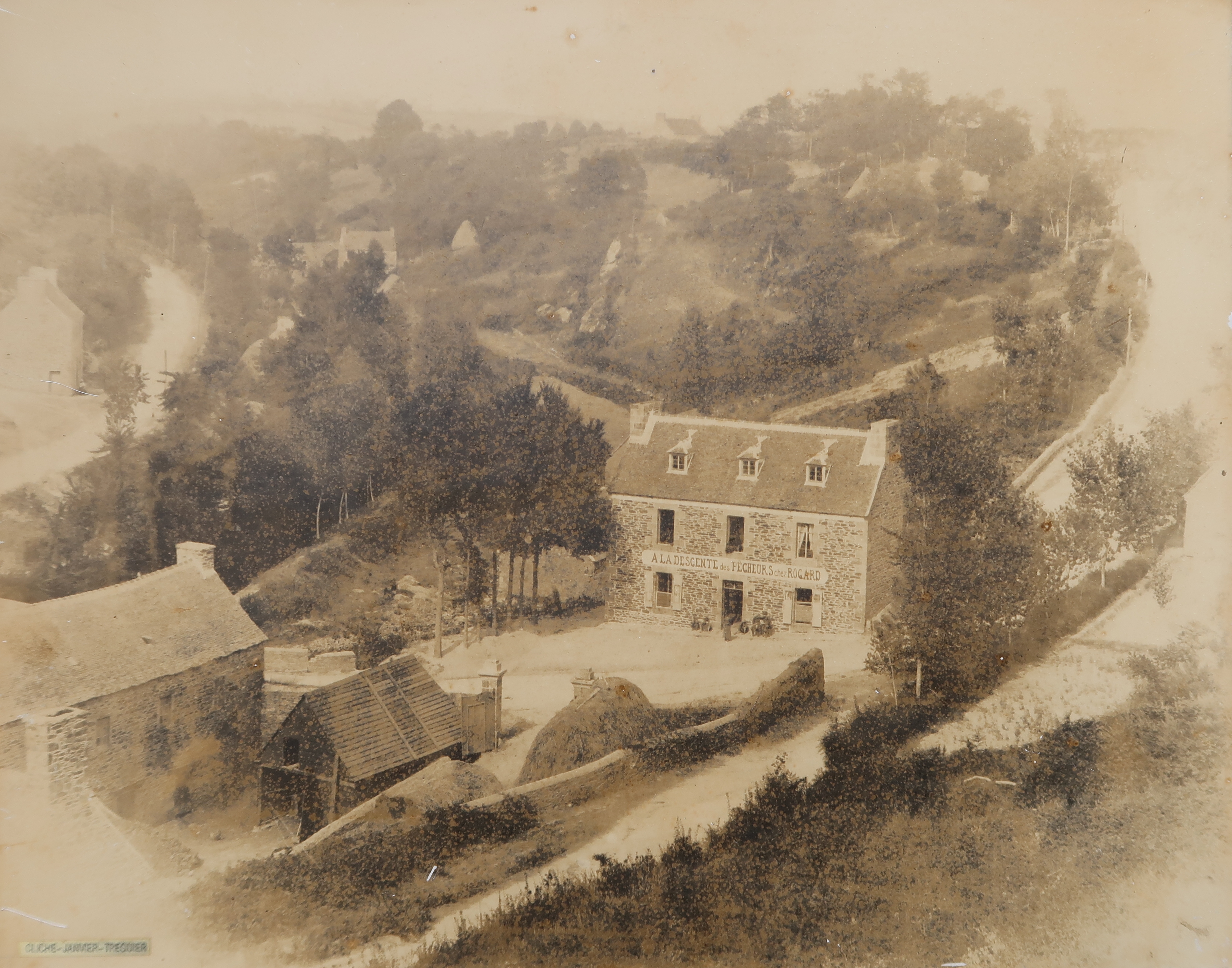 Minihy-Tréguier : vue générale de la vallée du Guindy avec ses moulins à eau, début du 20e siècle (collection particulière de Marie Follezou). Sur l'enseigne du débit de boissons du pont du Guindy, on peut lire : "A la descente des pêcheurs - chez Rogard"Immatriculation