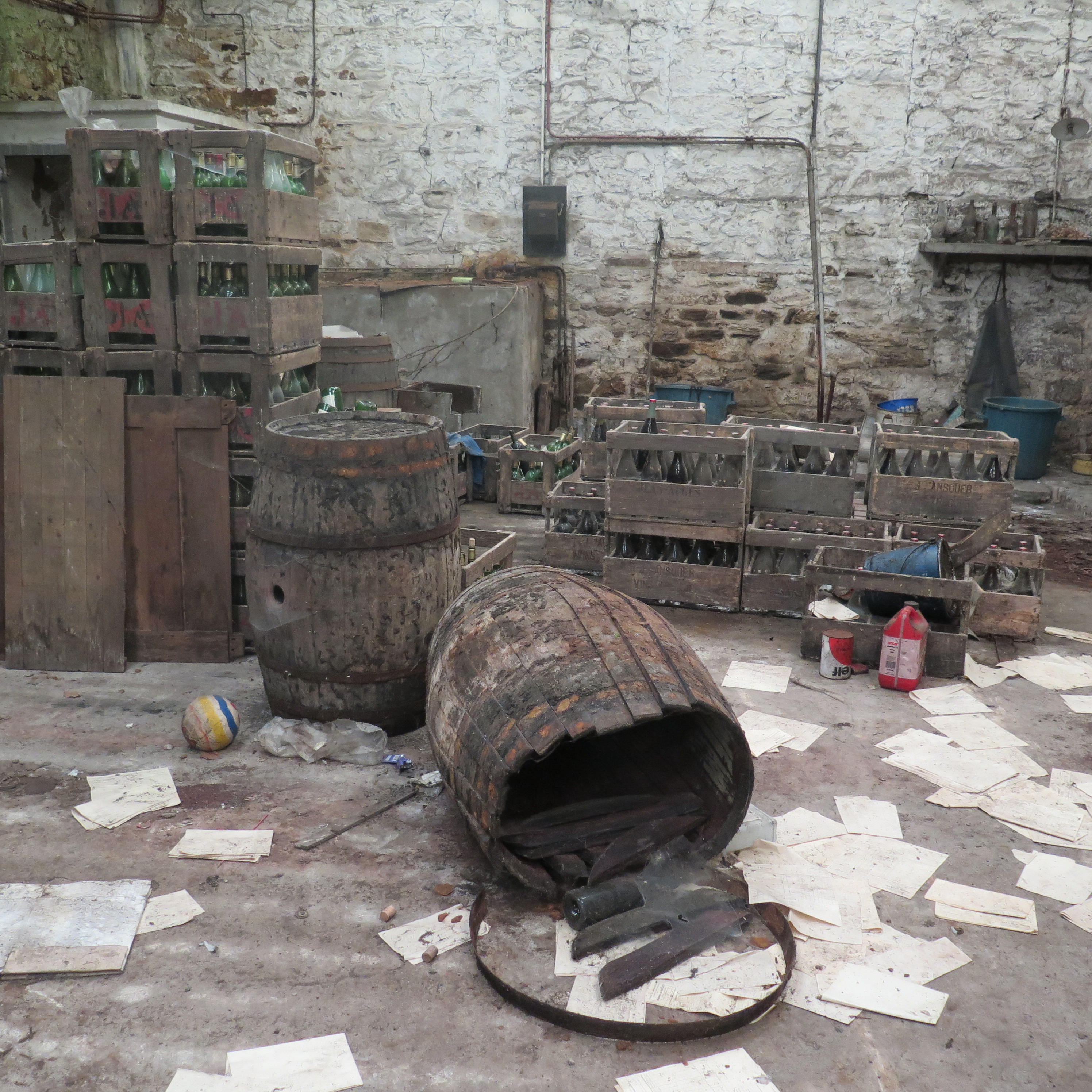 9 rue Colvestre : entrepôt à charpente métallique de la famille Ansquer, négociant en vins et en cidres, casiers à bouteilles marqués "Joseph Ansquer / Vins Tréguier" et tonneauxImmatriculation