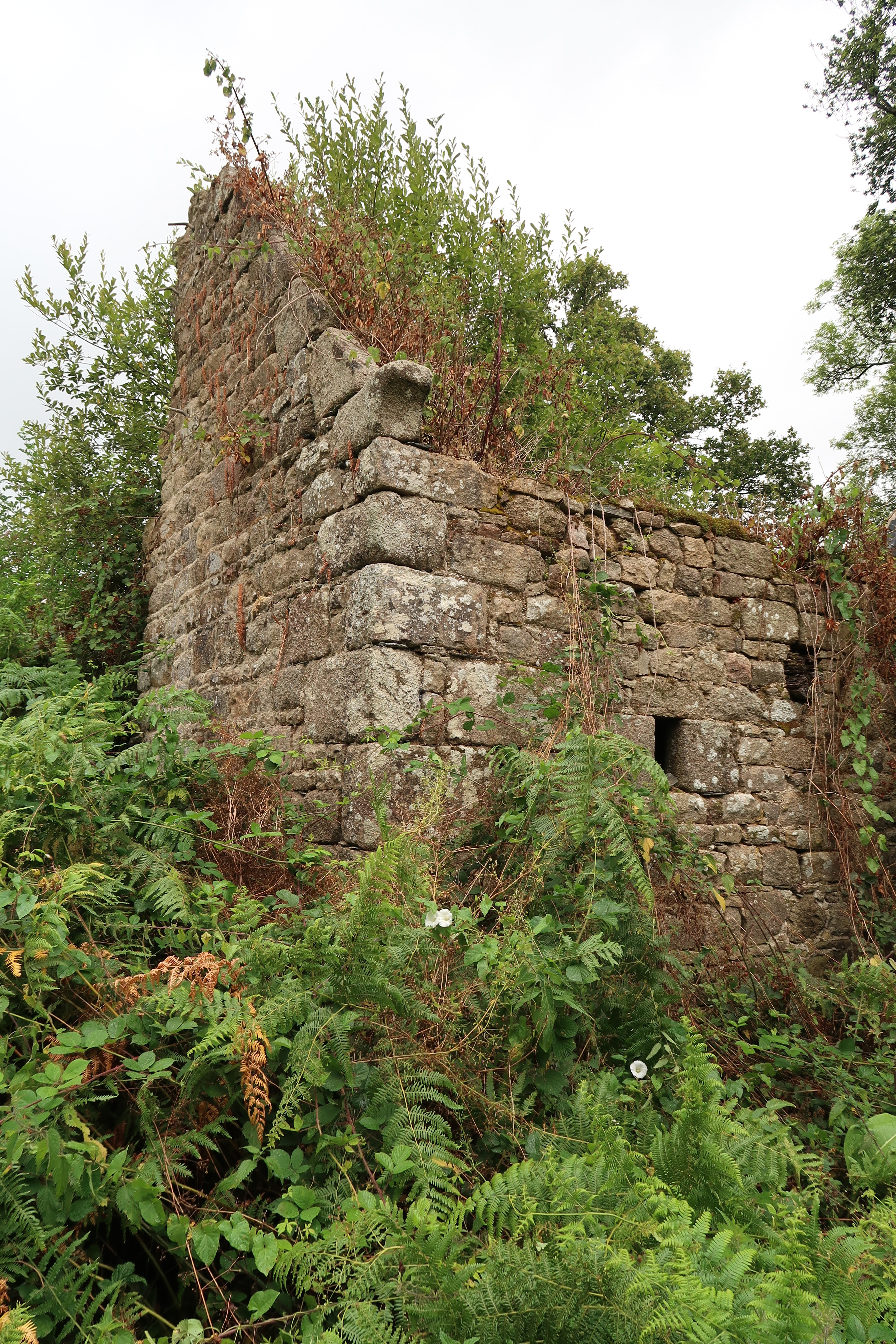 Moulin, détail de l'élévation sud et du pignon ouest (état en 2019). On notera la présence de rampant et crossette moulurée en pierre de taille de granite. Le petit jour correspond à un kuz gweleImmatriculation