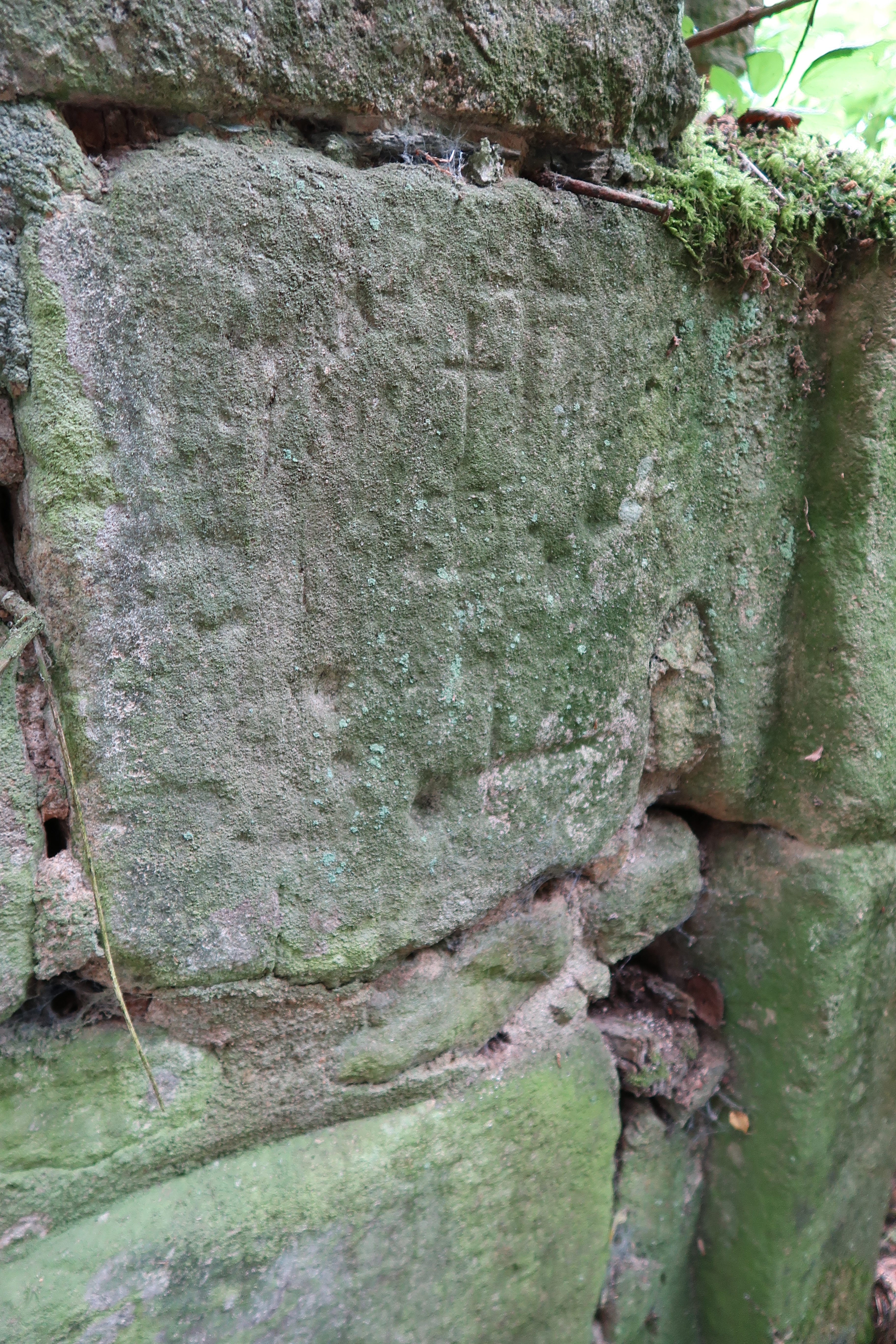 Moulin, vue intérieure après effondrement de la charpente et de la couverture, détail du piédroit de la porte ouest, graffitis et inscriptions pieuses (croix, monogramme du Christ) (état en 2019)Immatriculation