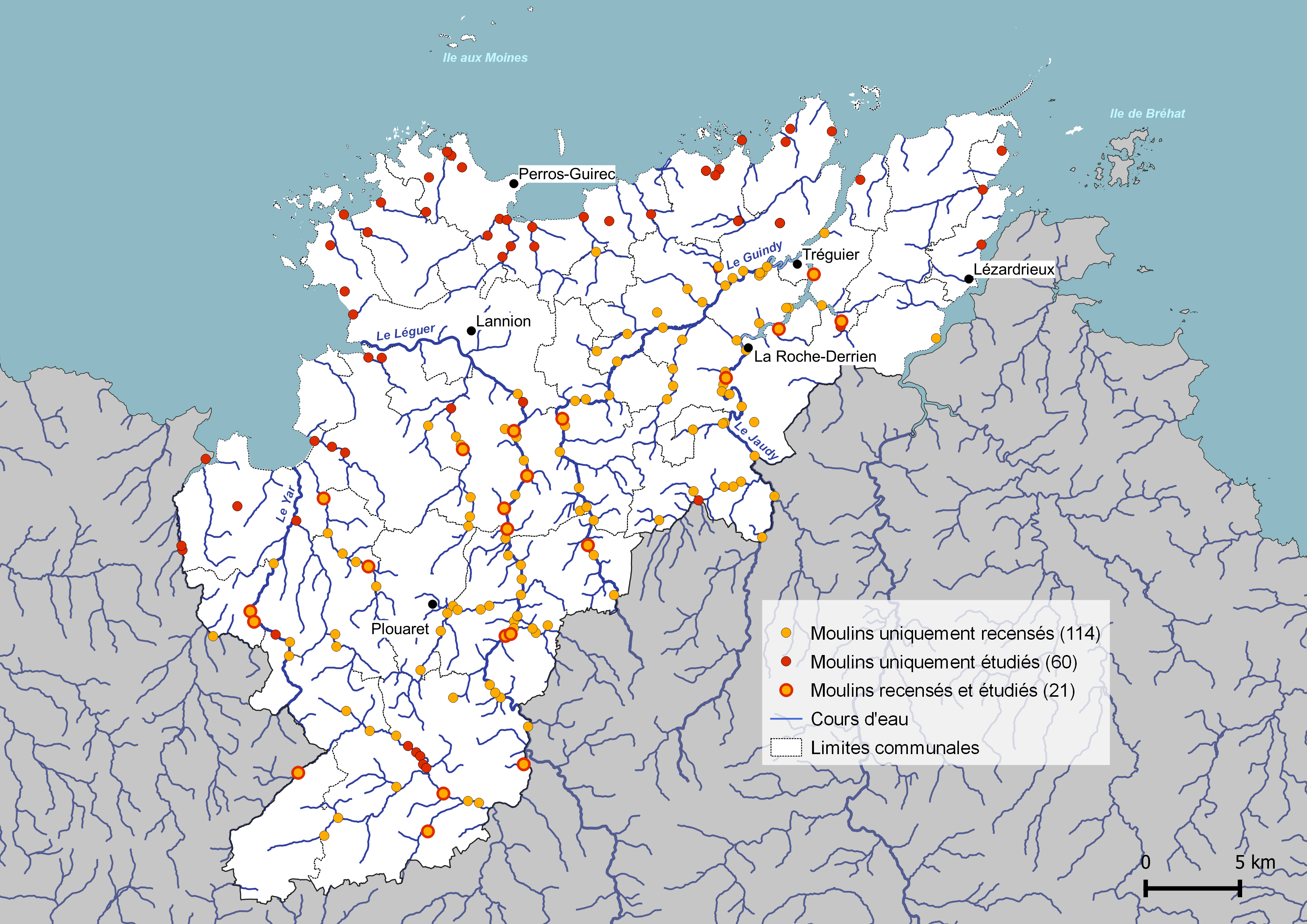 Couche des moulins seulement étudiés : Région Bretagne, service de l’Inventaire du patrimoine culturel, 2019.