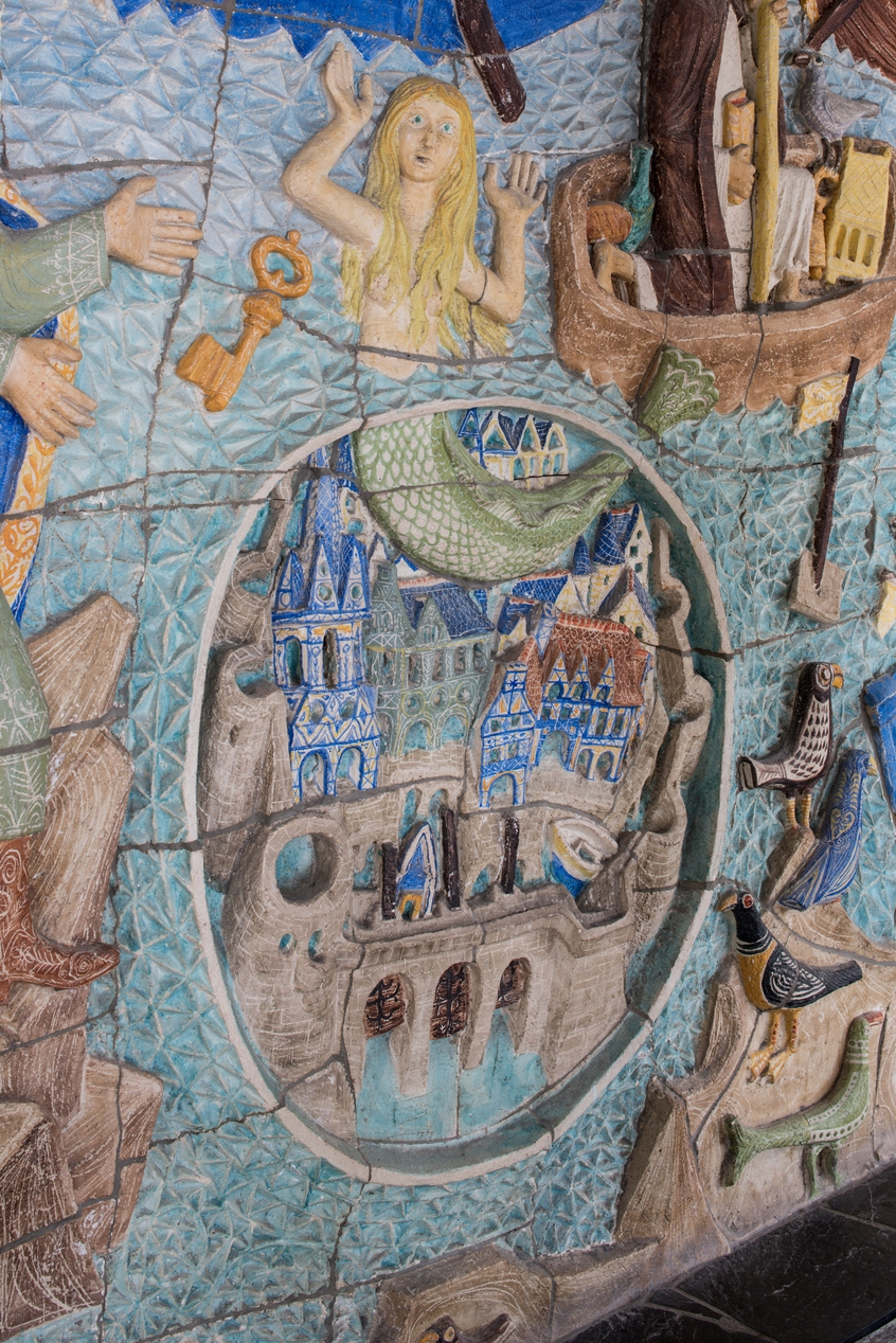 Pierre Toulhoat, "Armor", bas-relief en céramique de Quimper (1962). Œuvre du 1% artistique installée dans un foyer de l'internat (bâtiment D) : détail, engloutissement de la cité d'YS.Immatriculation