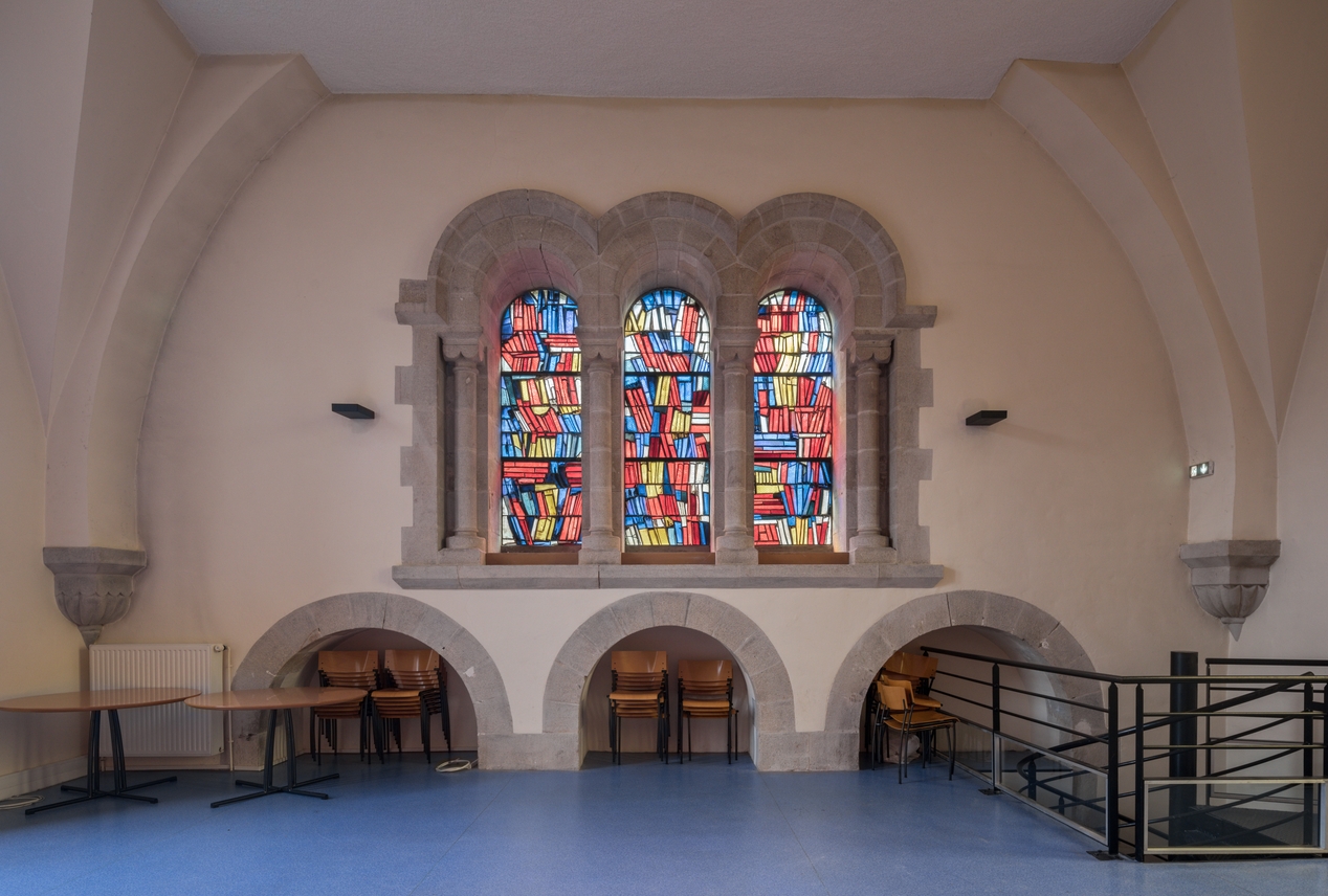 La chapelle aménagée en CDI : détail sur les vitraux figurant des livres, datant de la réhabilitation de 1999.Immatriculation