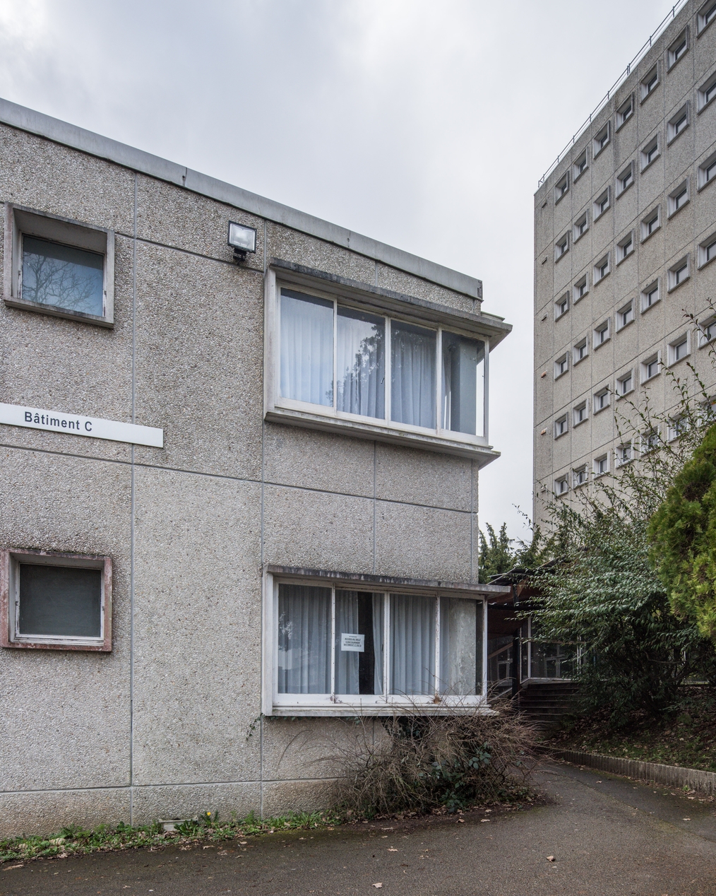 Bâtiment d'externat (à l'origine, études de l'internat), détail de l'angle nord, Raymond Lopez architecte, 1958. A droite, la grande barre d'internat.Immatriculation