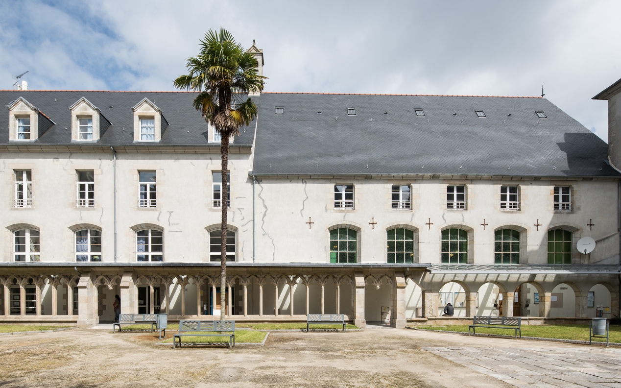 Bâtiments de l'ancien séminaire, aile nord-ouest. A droite, chapelle des Sœurs du Calvaire (1663), à gauche, cloitre des Carmes de Pont-L'Abbé (15e siècle, remonté ici en 1902).Immatriculation