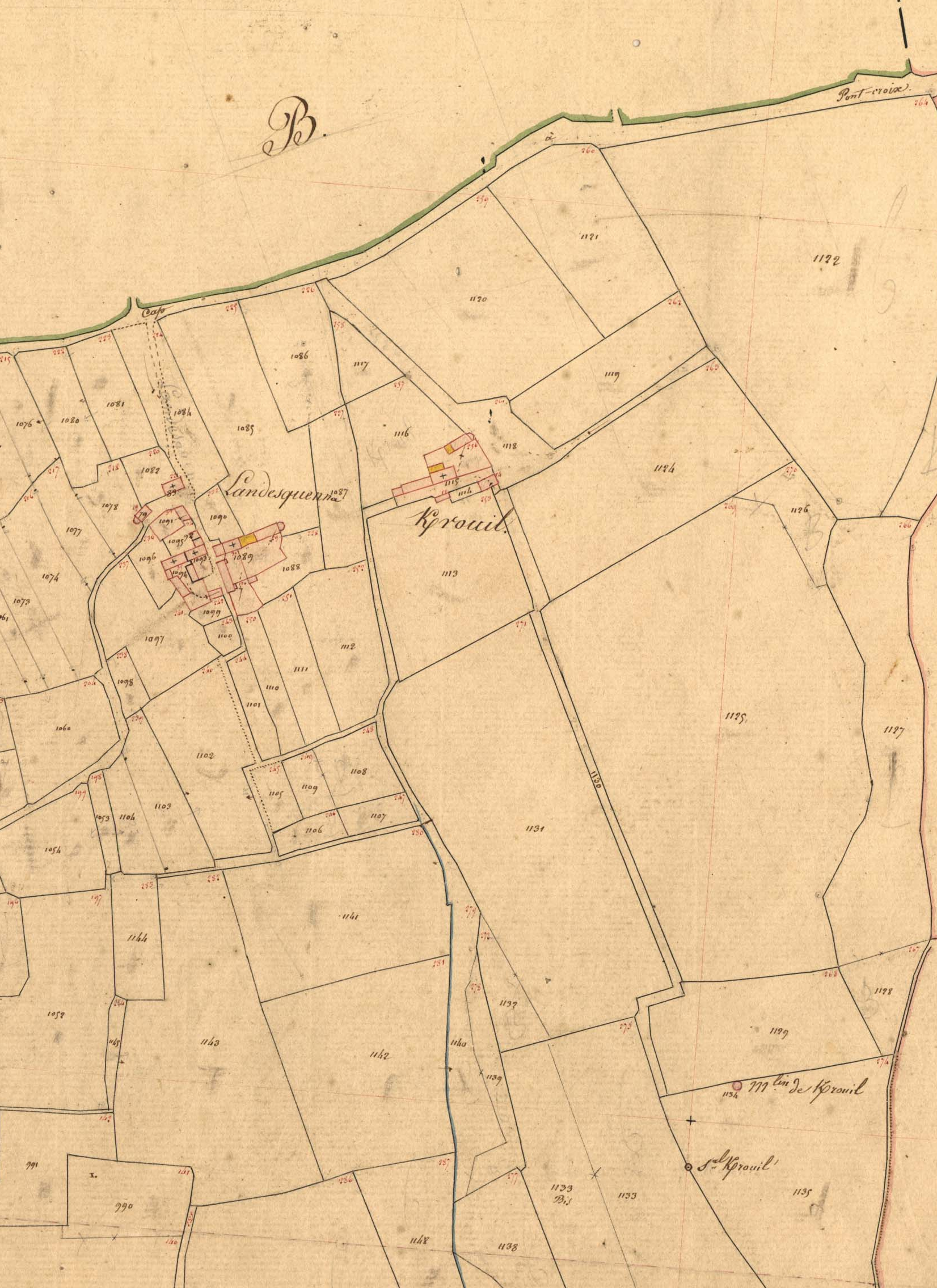 Landesquenna, Kerouil et moulin de Kerouil, cadastre ancien de la commune de Primelin, 1837.Immatriculation