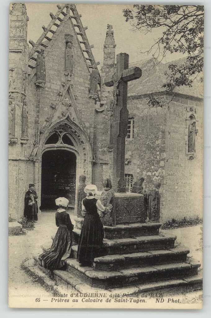 Calvaire dans le placître de la chapelle Saint-Tugen daté 1821, vue générale prise du sud-ouest vers 1900. (Repro Carte Postale)Immatriculation