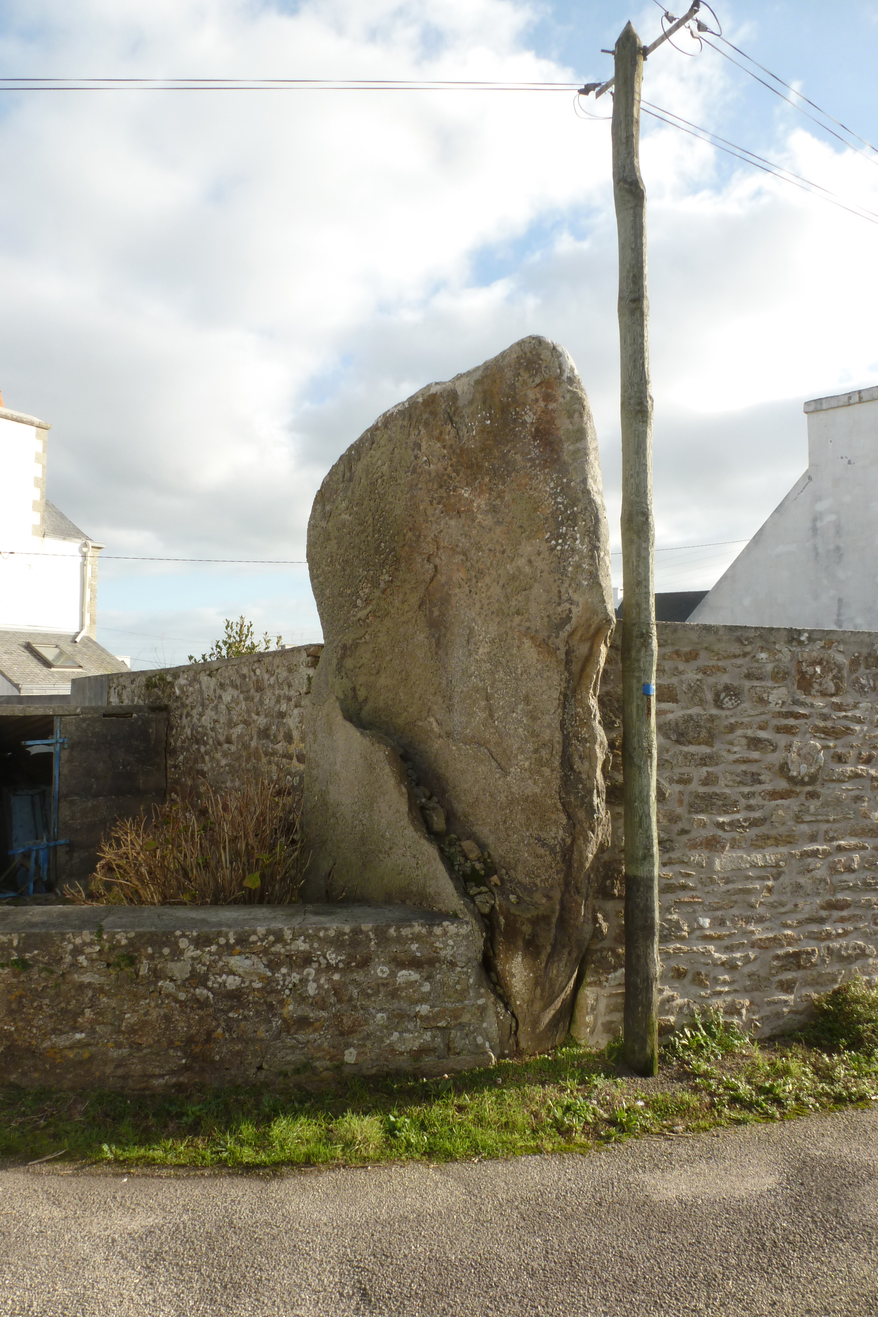 Menhir incrusté dans le muret d'une propriété. Vue générale prise de l'ouest.Immatriculation