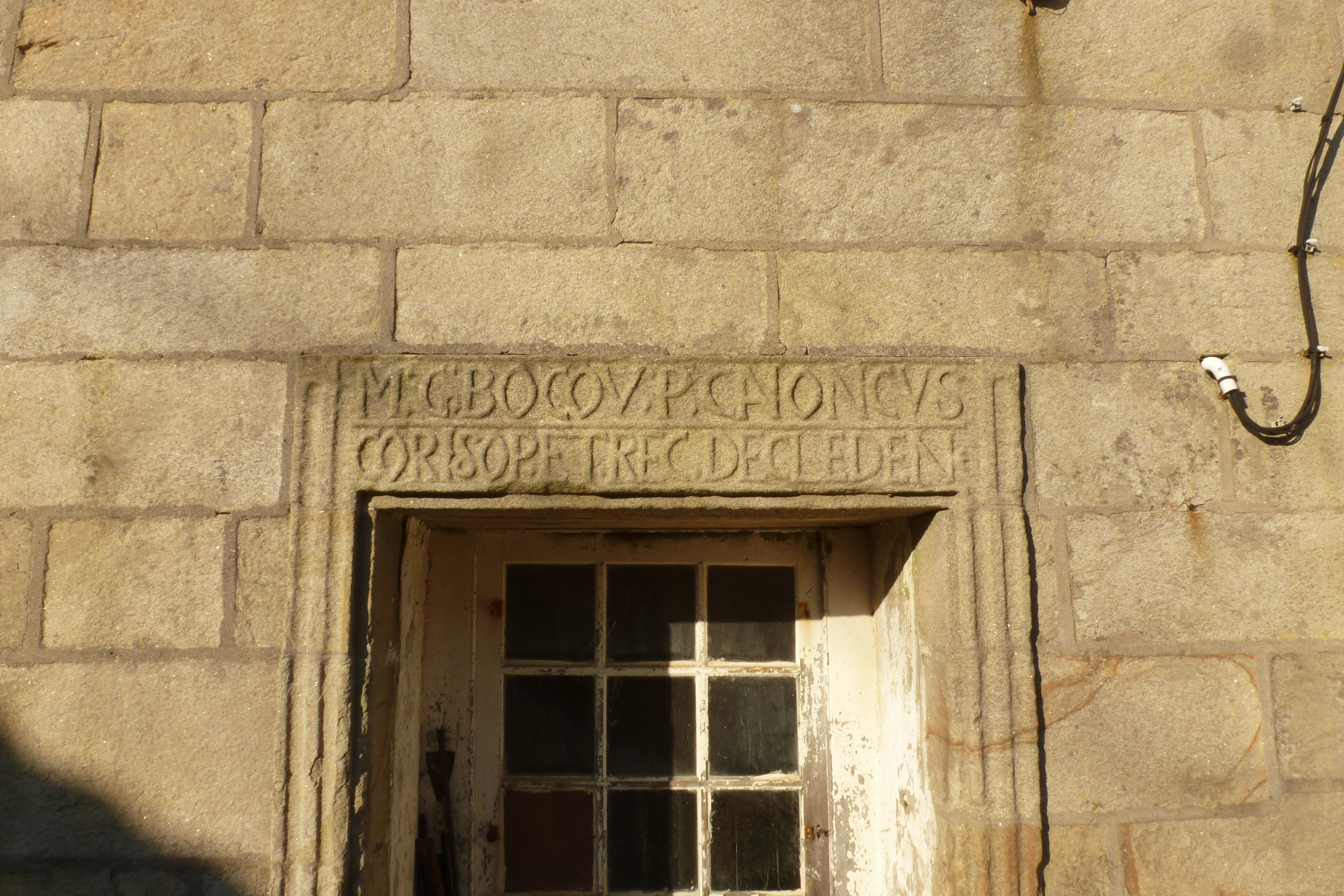 Elévation antérieure du logis daté 1661, linteau de la porte d'entrée et inscriptions. (2019)Immatriculation