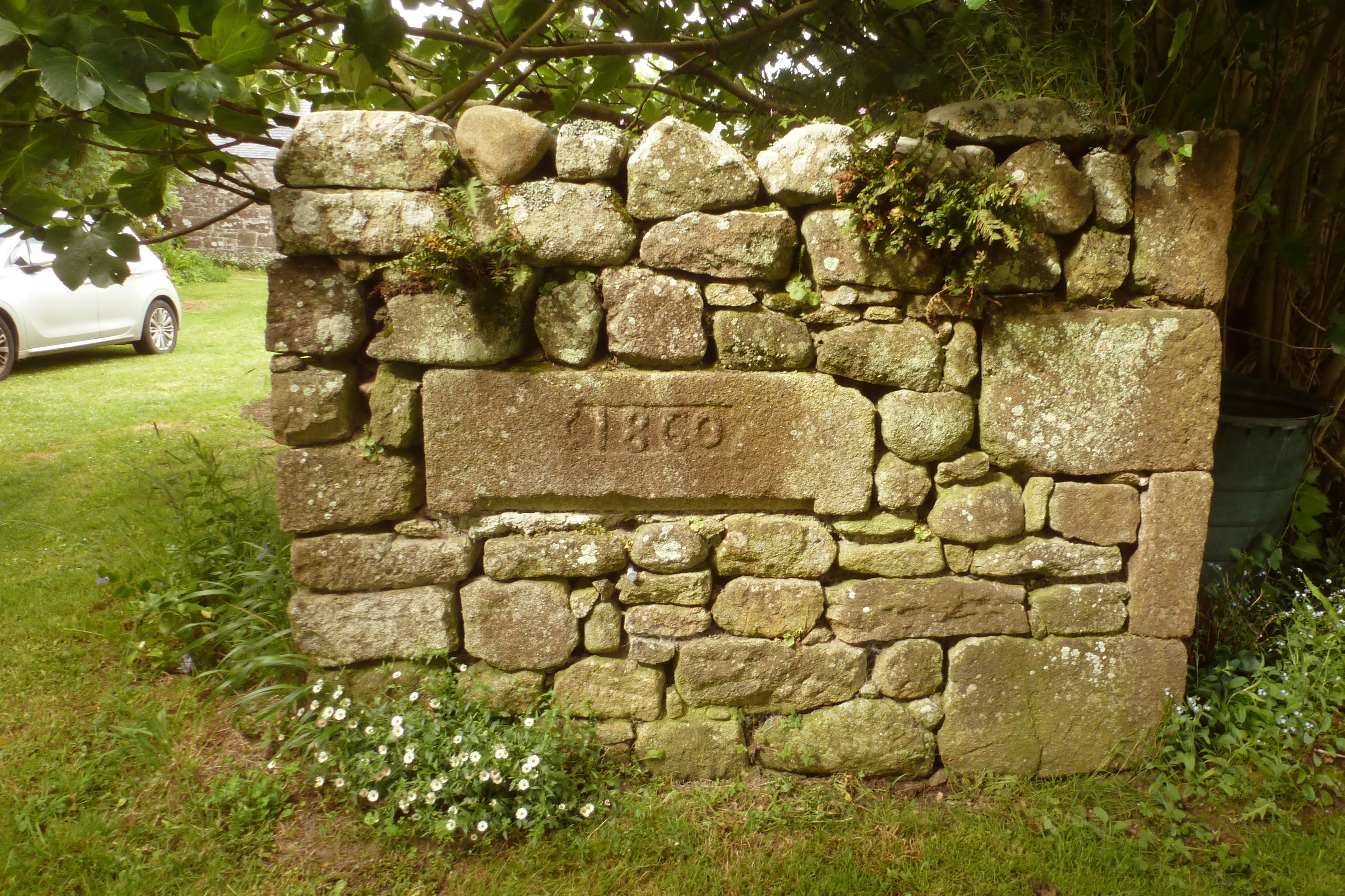 Linteau des anciennes crèches à cochon intégré dans un muret de clôture.Immatriculation