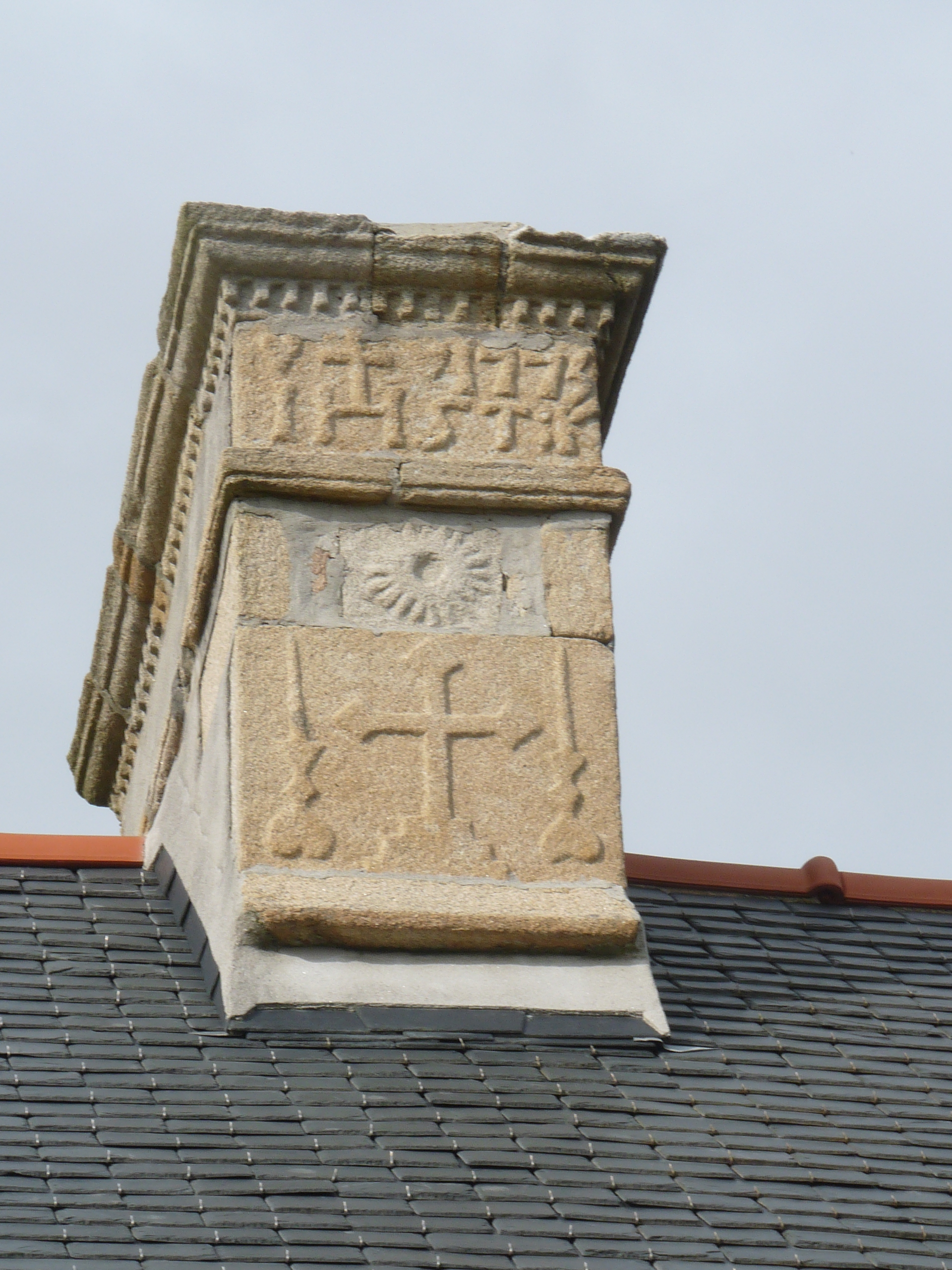 Kerlazen, ferme 1, façade antérieure du logis, détail de la souche de cheminée ouest et inscription : IHS T:K 1773. (2018)Immatriculation
