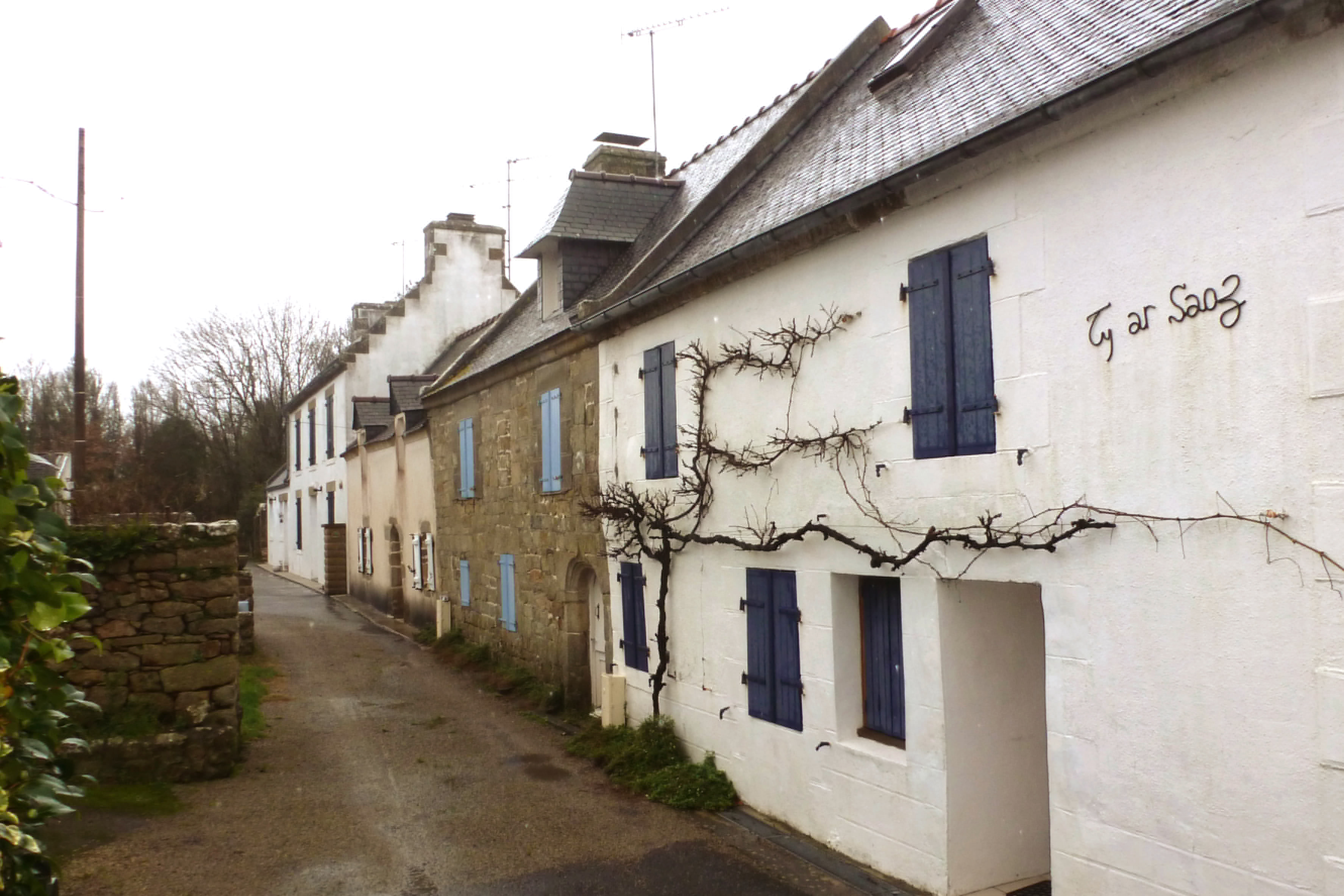 Kerscoulet, ruelle secondaire. Alignement de maisons.Immatriculation
