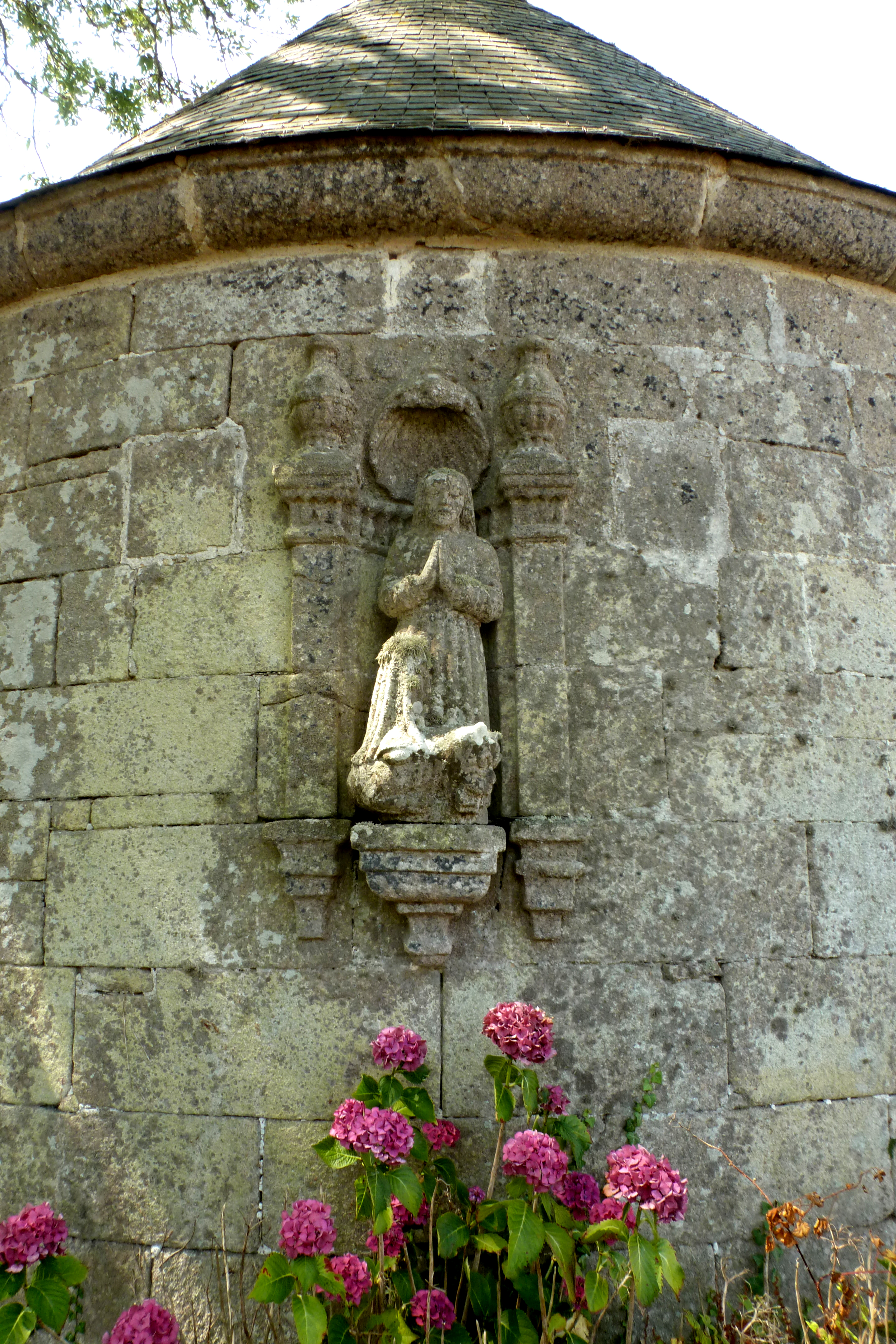 Chapelle Sainte-Marguerite, détail de la statue de la sainte sur le chevet et date portée : 1626. (2019)Immatriculation