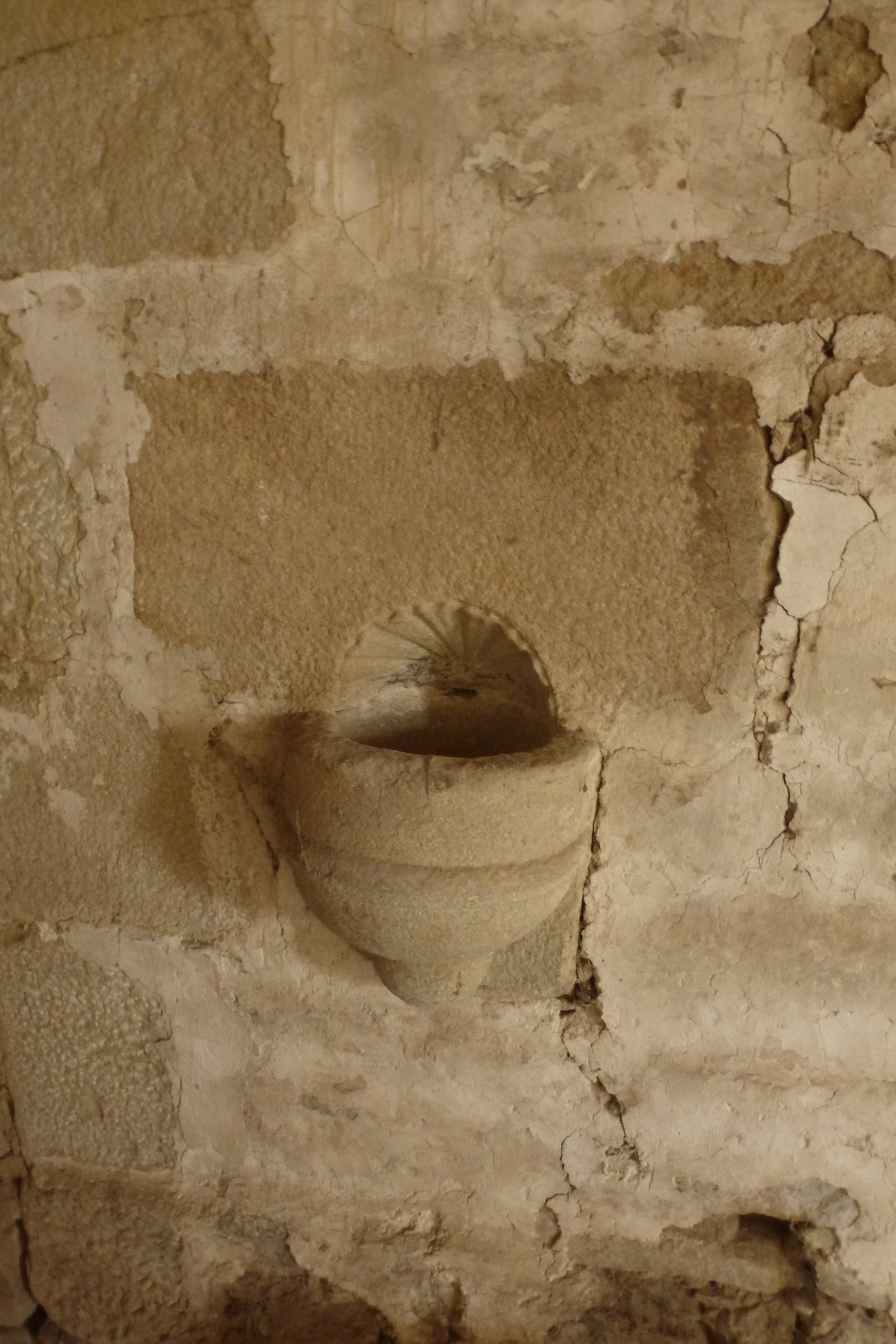 Chapelle Sainte-Marguerite, mur nord, bénitier. (2019)Immatriculation