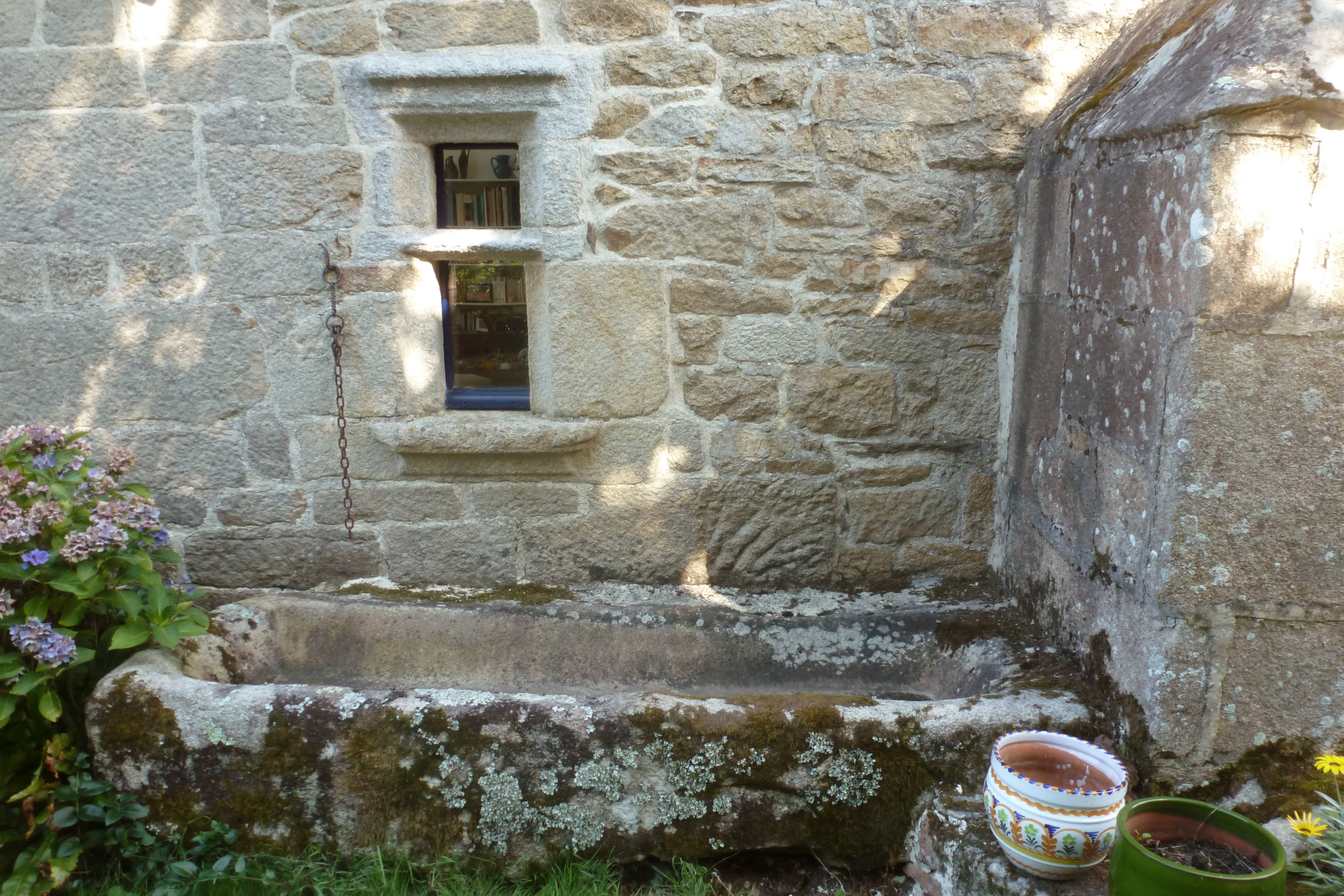 Ancien logis daté 1727 devenu dépendance agricole, détail de la fenêtre est et auge monolithe destinée à piler l'ajonc. (2019)Immatriculation