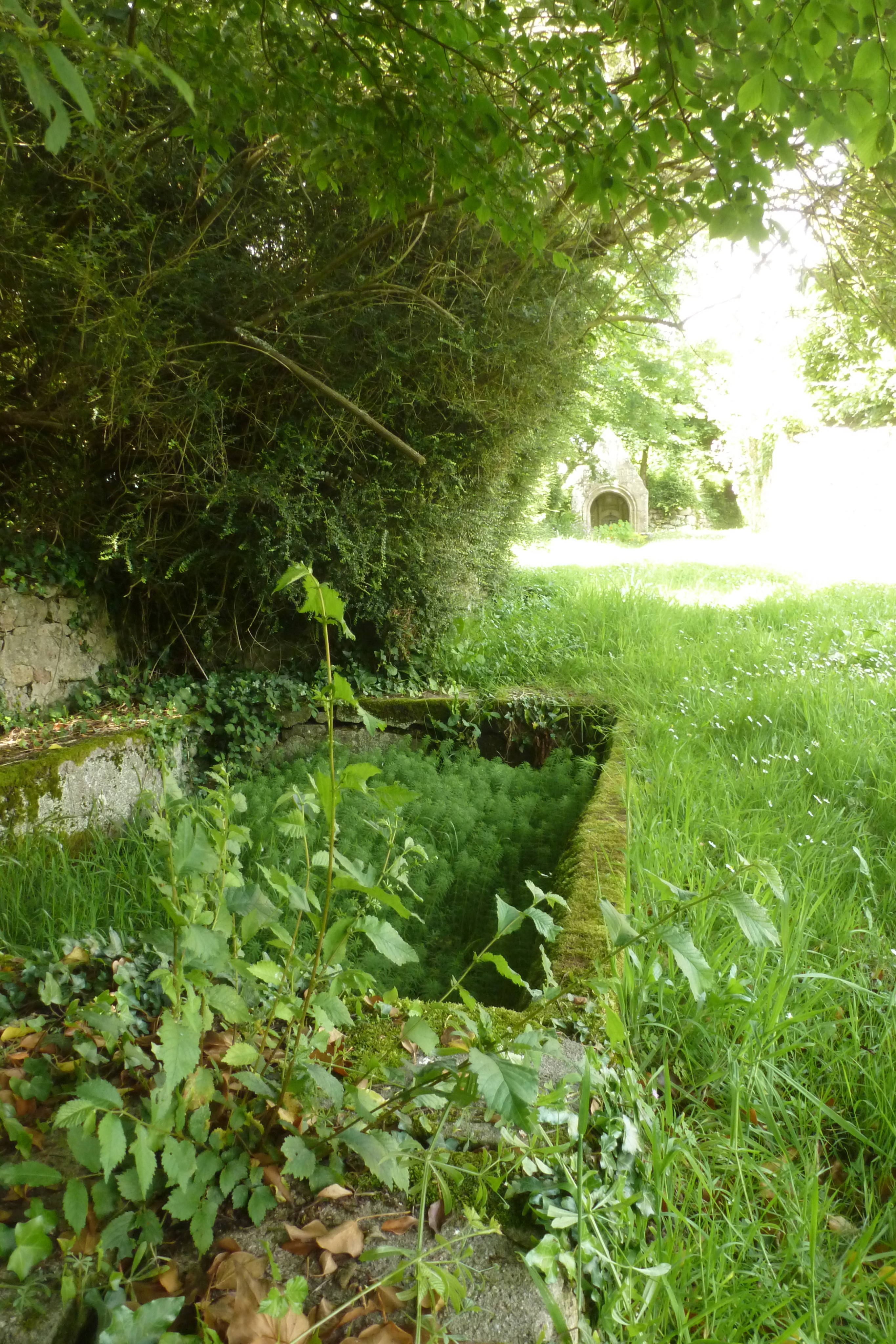 Landugentel, lavoir 1 situé en contrebas de la fontaine Sainte-Brigitte. Vue prise du sud avec fontaine en arrière plan.Immatriculation