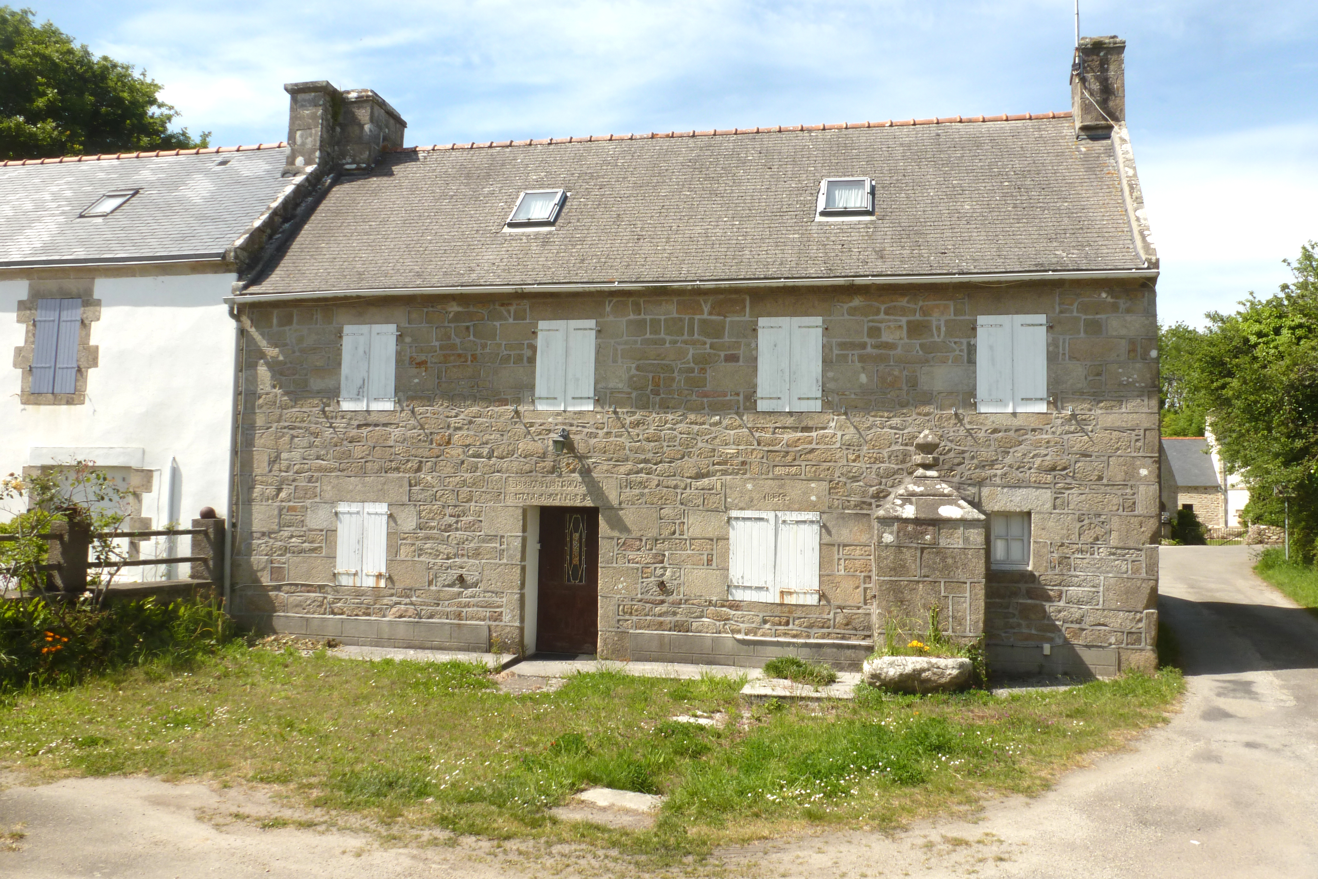 Kerounous, ferme 3 datée 1836, élévation antérieure du logis et puits accolé à la façade.Immatriculation