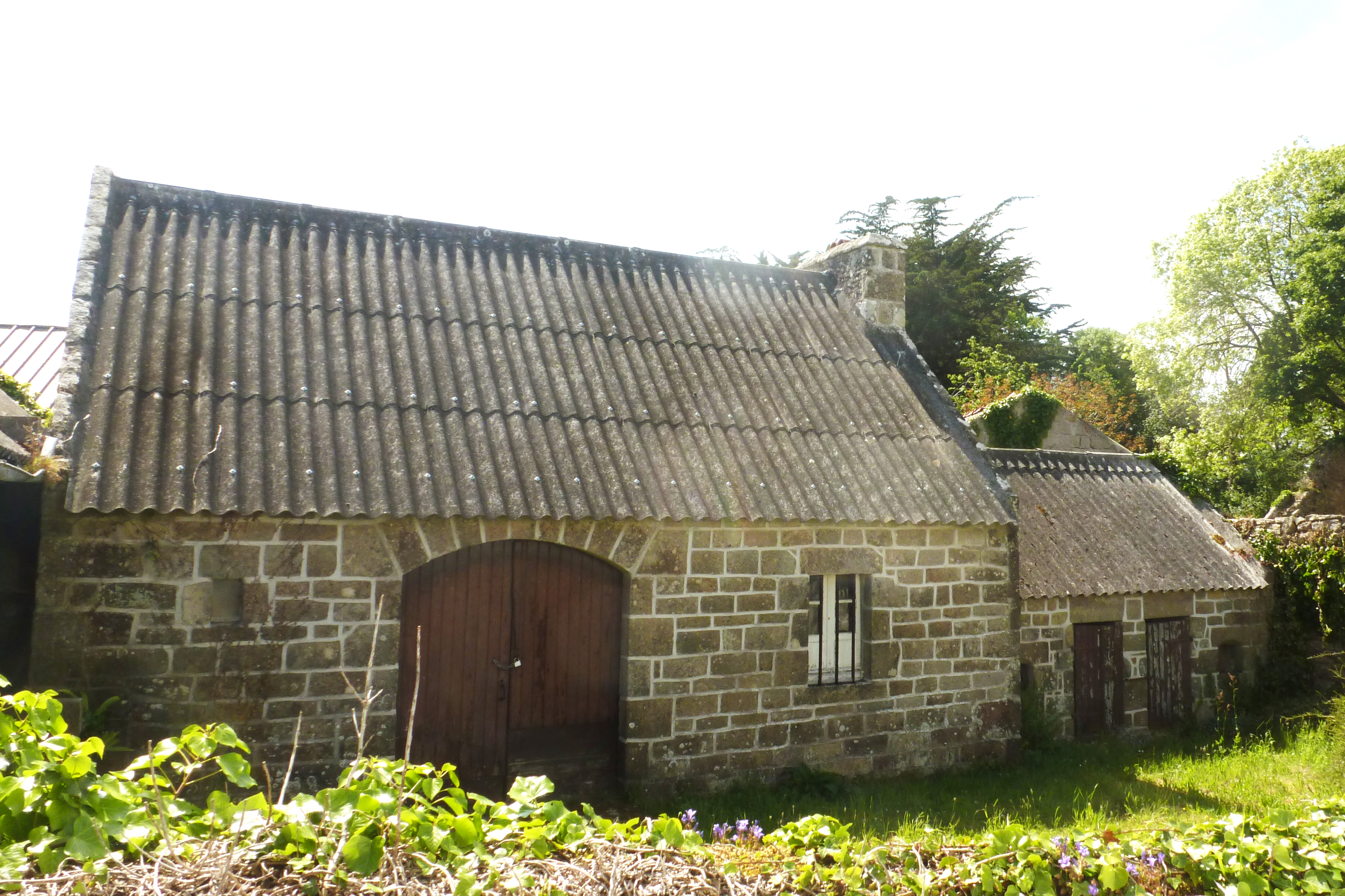 Kerounous, ferme 3 datée 1836, alignement grange à porte charretière et crèches à cochons, élévation est.Immatriculation