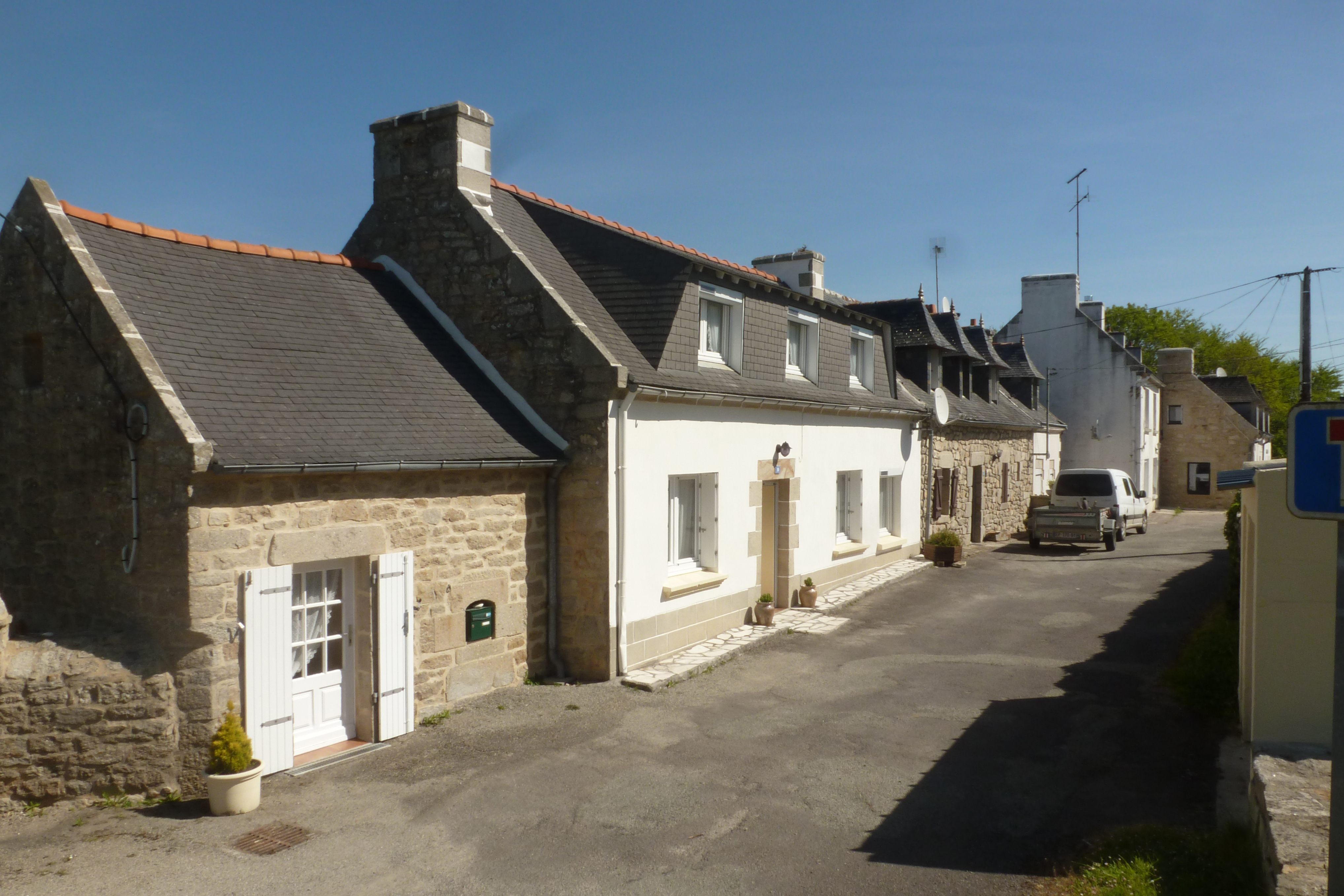 Kerlann, alignement de deux maisons aux façades remaniées et leurs crèches. Vue générale.Immatriculation