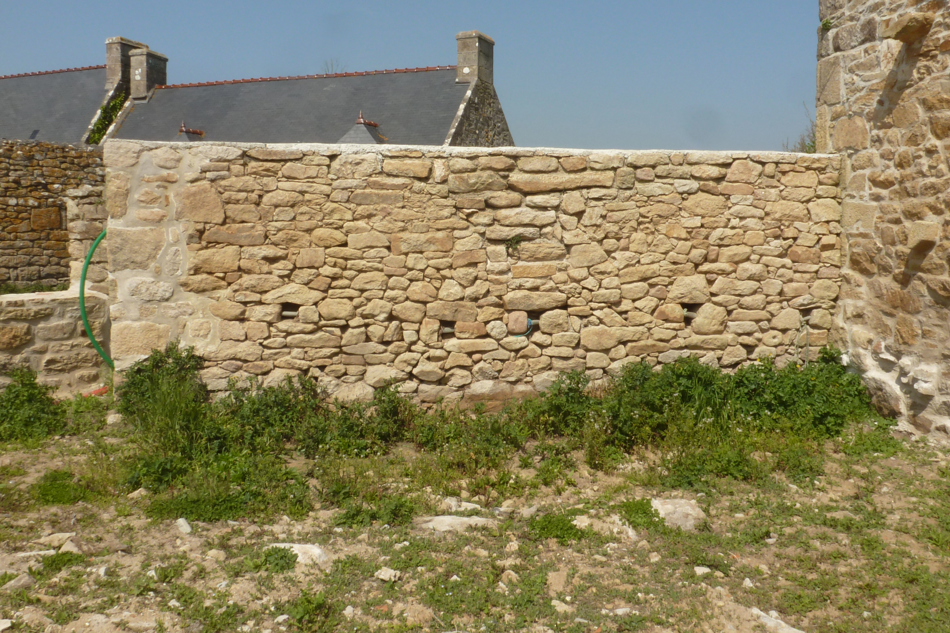 Le Créac'h, ferme 2, mur posterieur d'une ancienne étable. Vue sur les trous d'attaches avec galets intégrés.Immatriculation