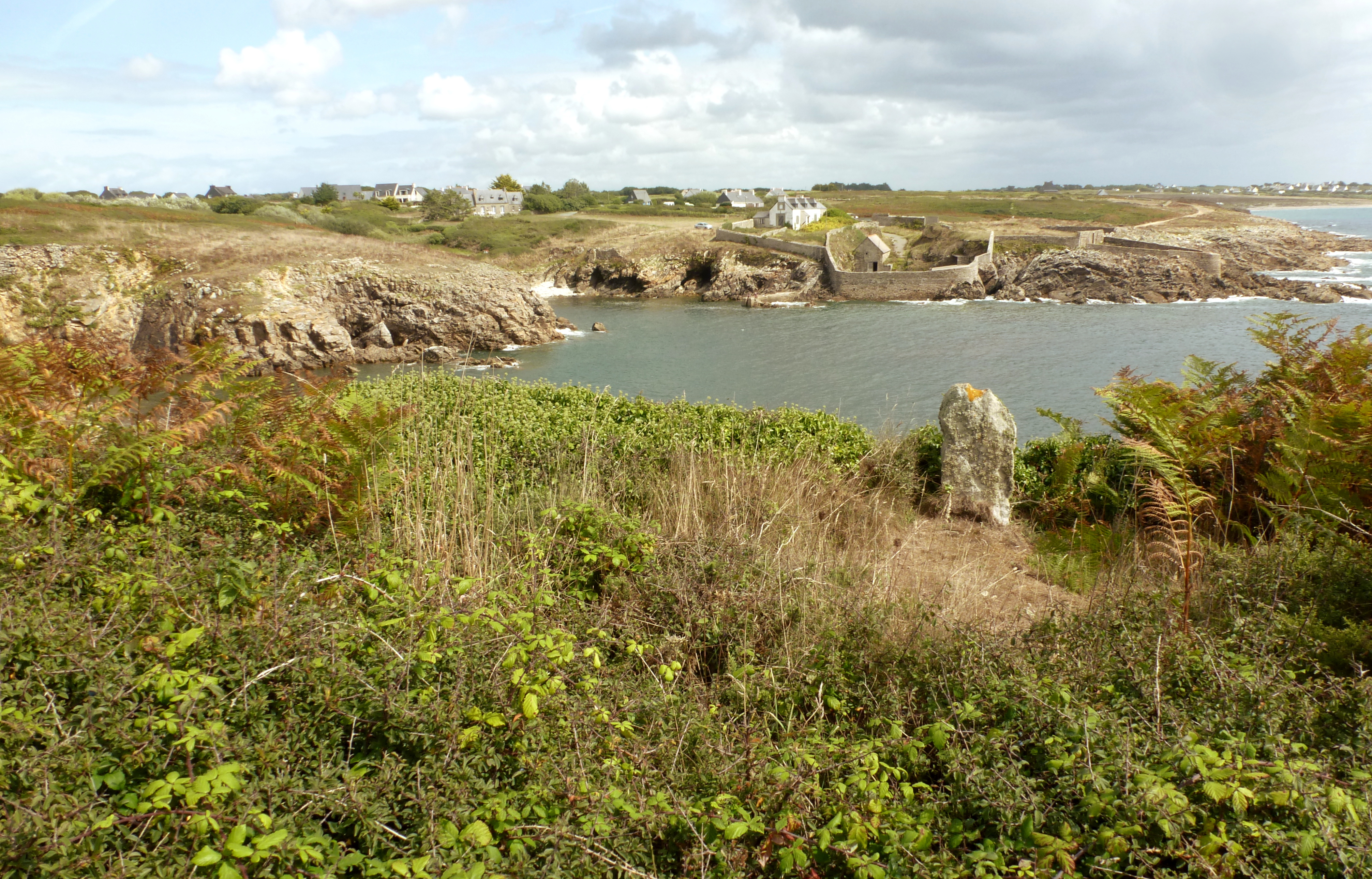 Vue générale de l'anse prise de l'ouest avec vestiges d'un mât de levage au premier plan.Immatriculation