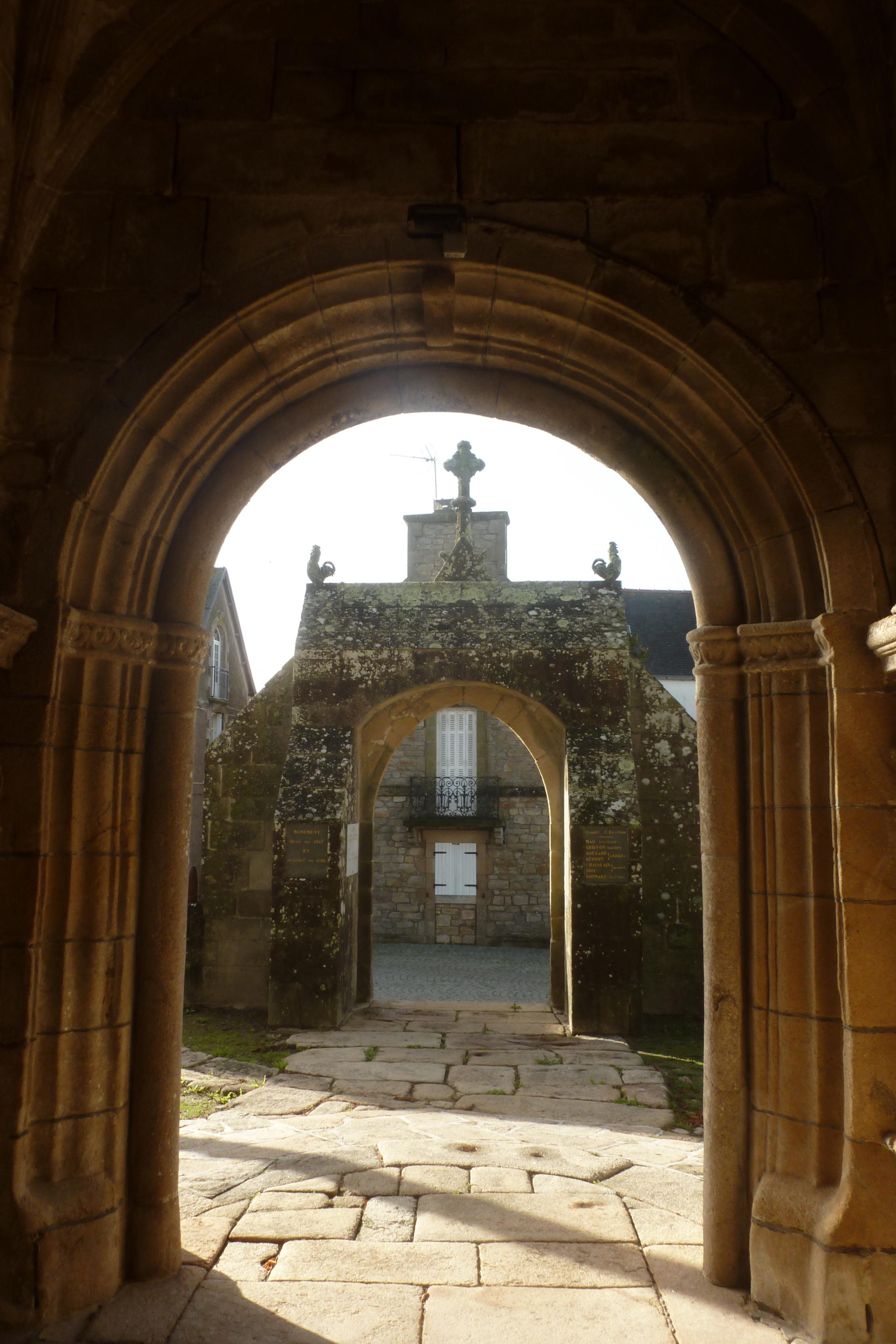 Porche sud, vue prise de l'intérieur vers le monument aux morts. (2019)Immatriculation