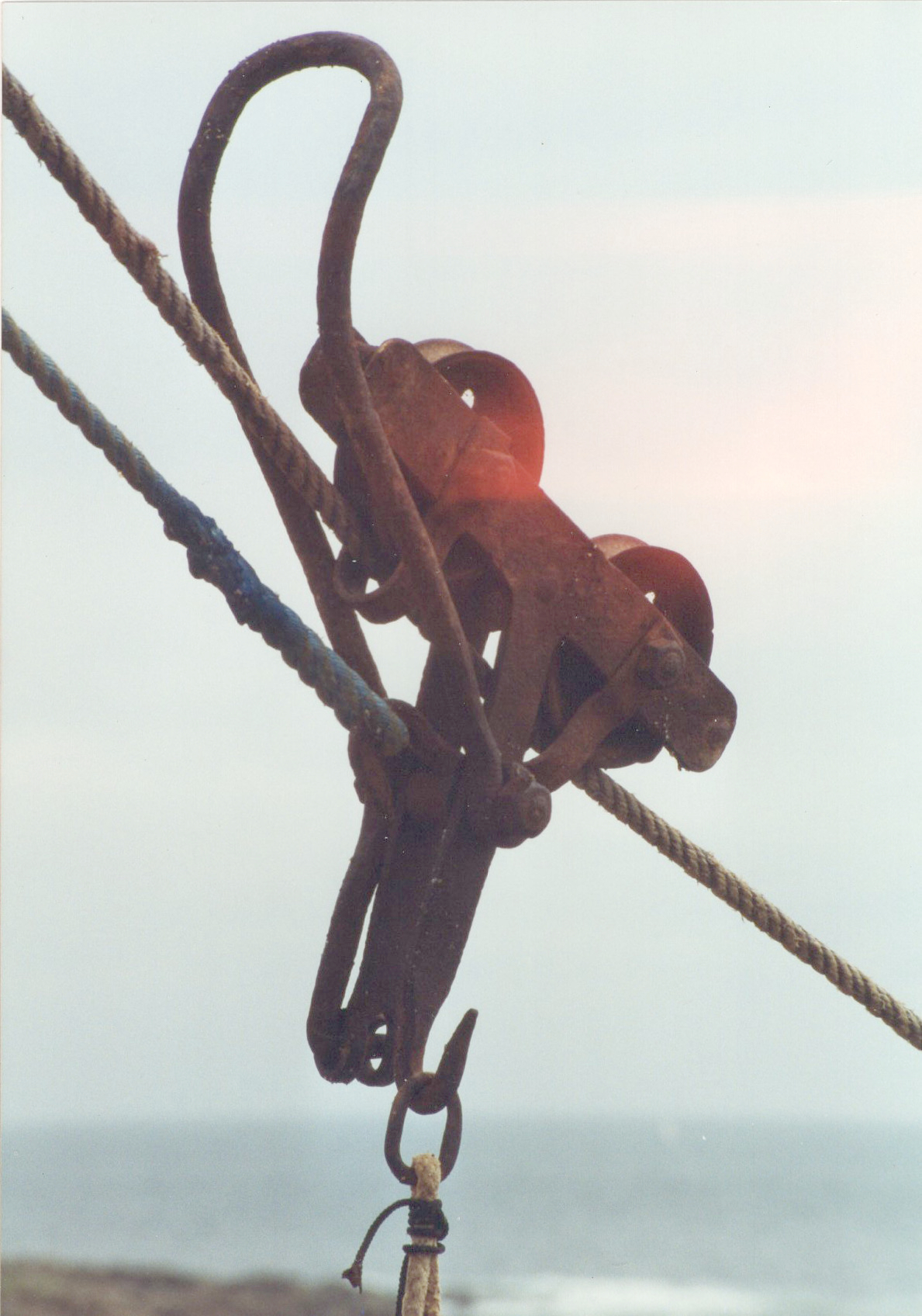 Lennac'h, mât de levage 1 équipé pour la fête du goémon. Détail de la poulie. (1987)Immatriculation