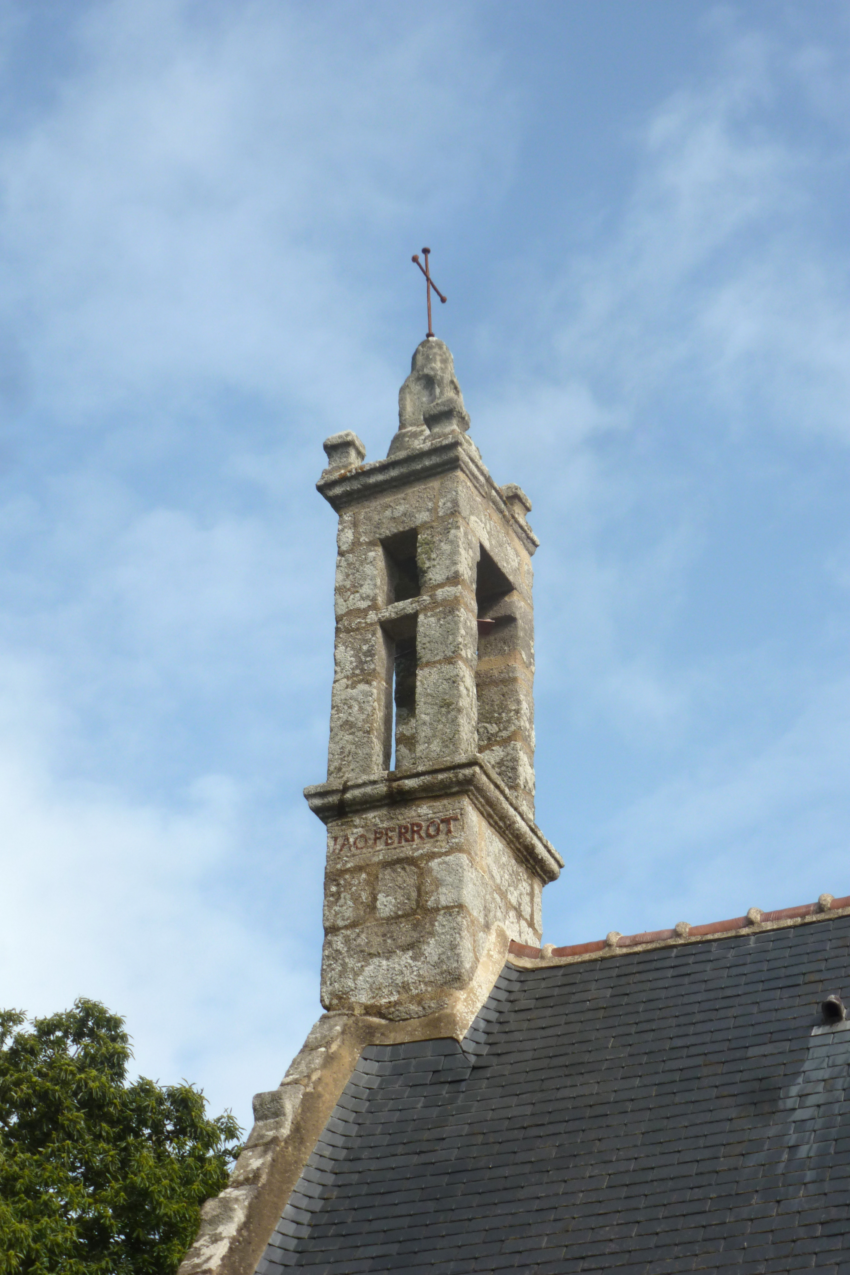 Clocher, vue rapprochée prise du sud. Inscription (?) PERROT. (2019)Immatriculation