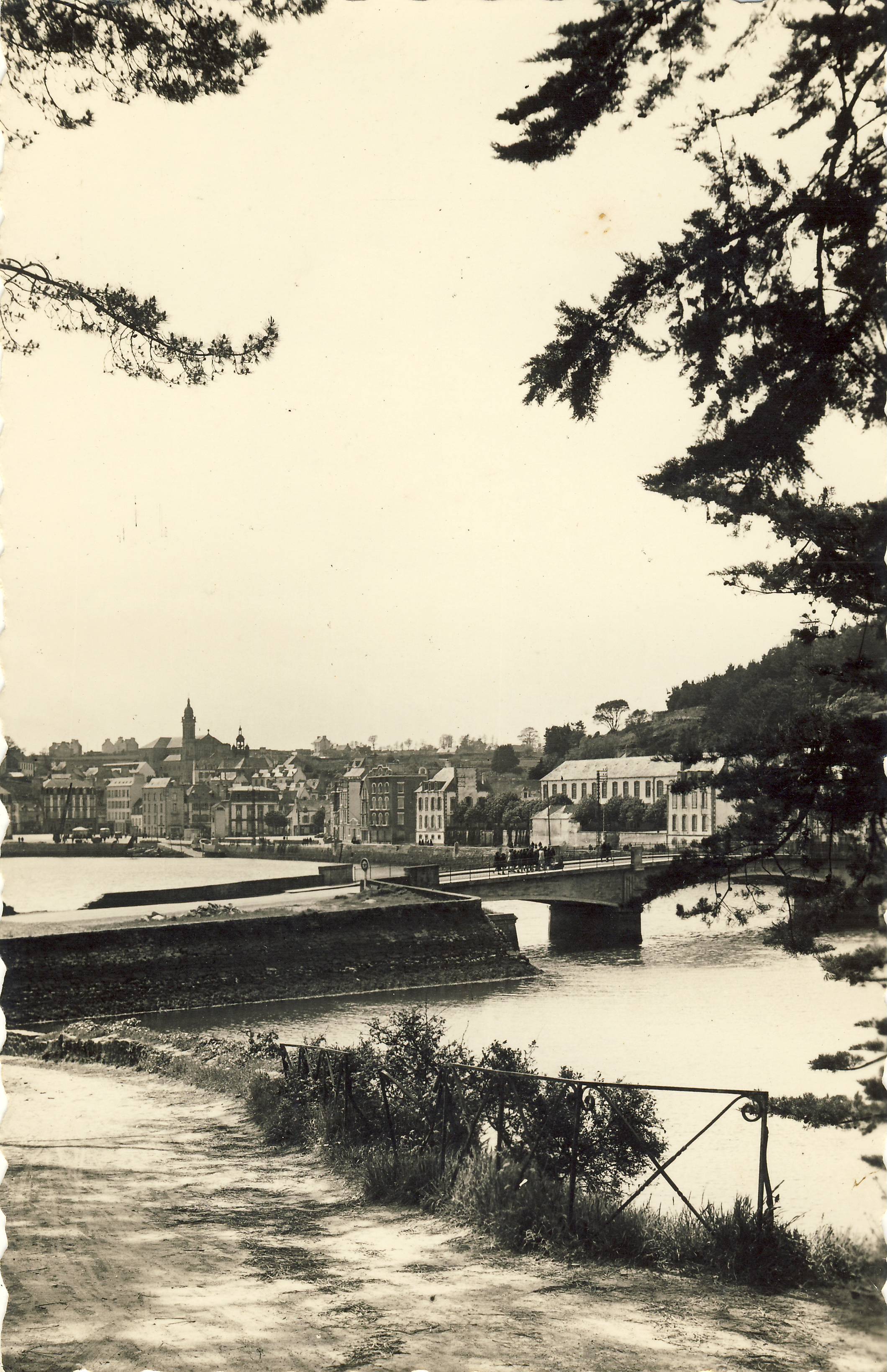 Deuxième pont, vue nord de la rive gauche du Goyen, côté Poulgoazec. Reproduction carte postale.Immatriculation