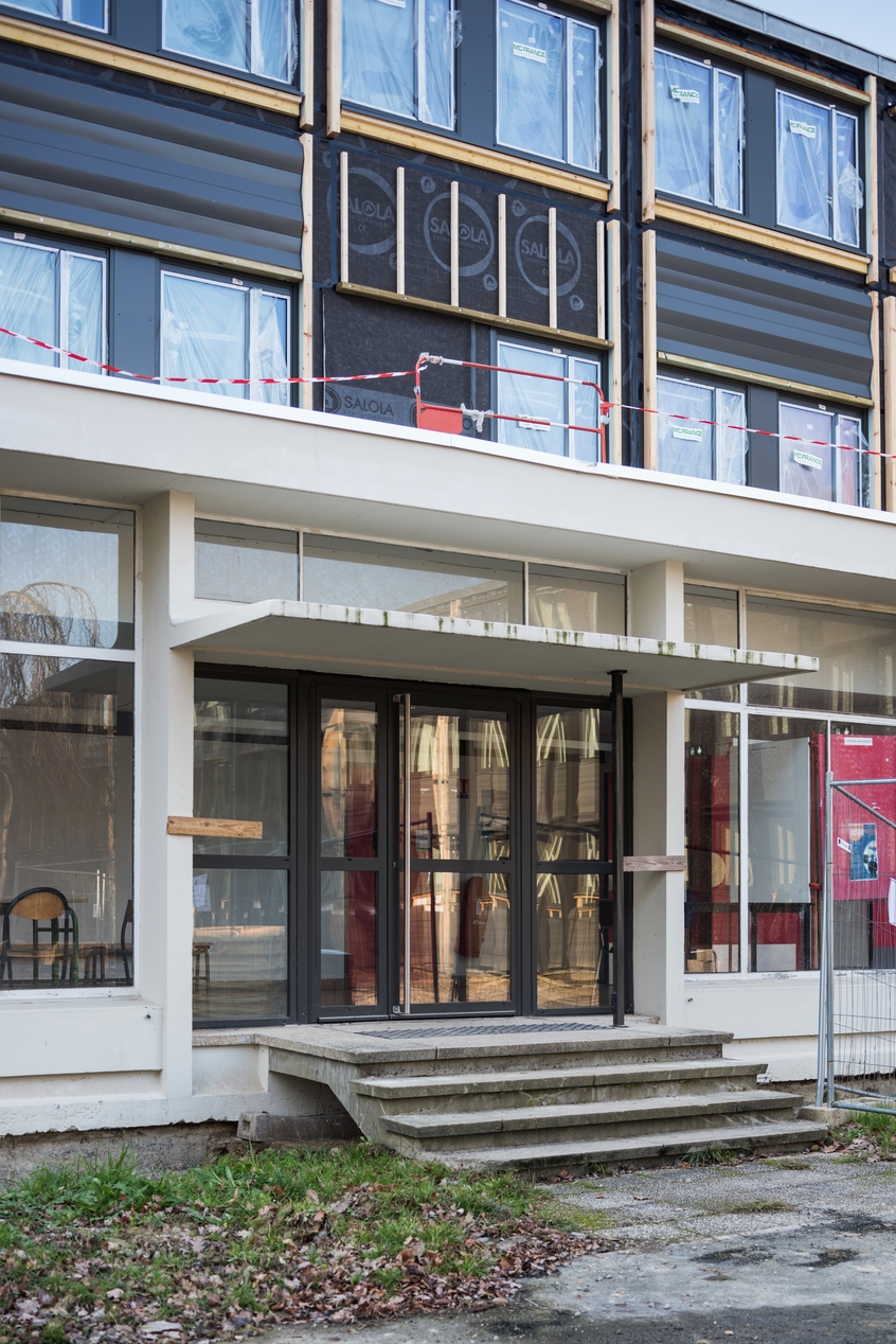 Externat B, façade est. Détail sur une entrée, ses escaliers et son auvent, avant travaux de réhabilitation thermique.Immatriculation