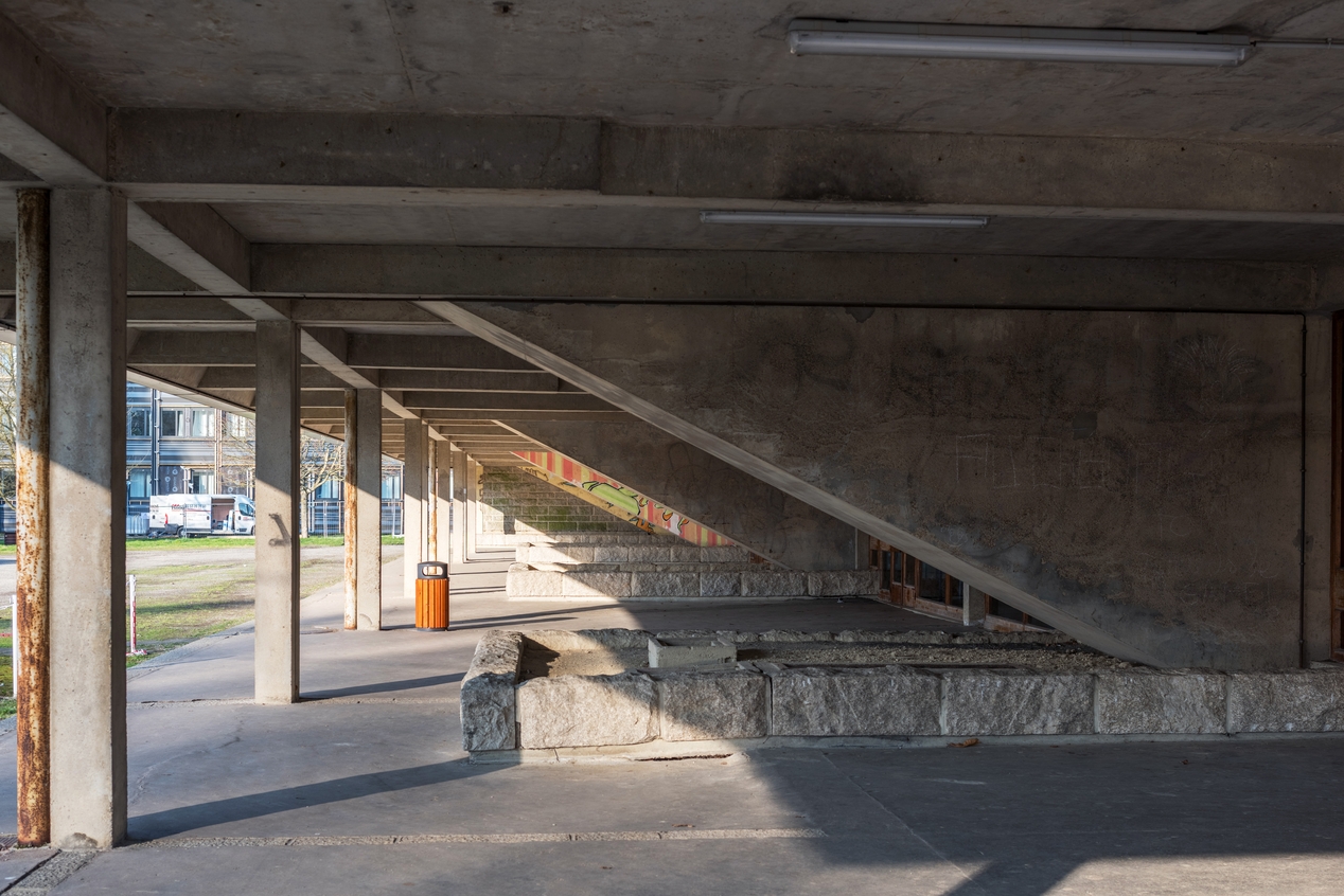 Réfectoire, rez-de-chaussée bas : préau, pilotis et structure des escaliers.Immatriculation