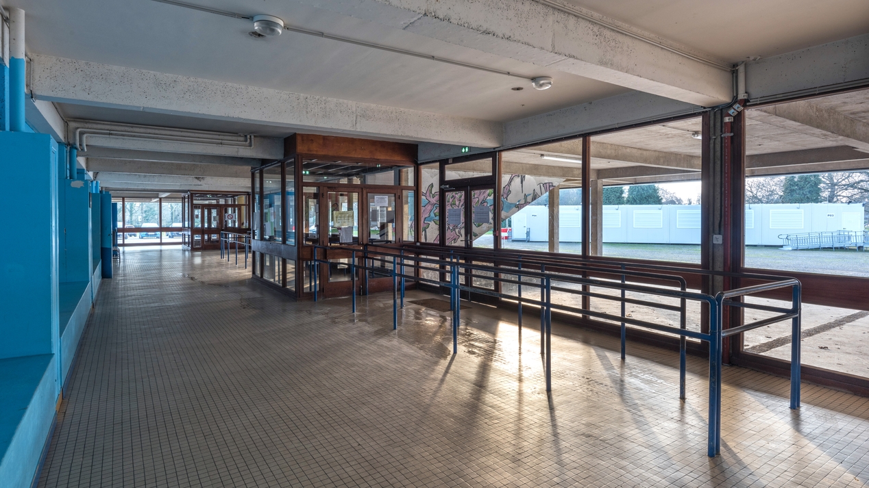 Réfectoire, rez-de-chaussée bas, côté ouest : couloir d'accès aux toilettes aux escaliers des self et dispositif des files d'attente.Immatriculation