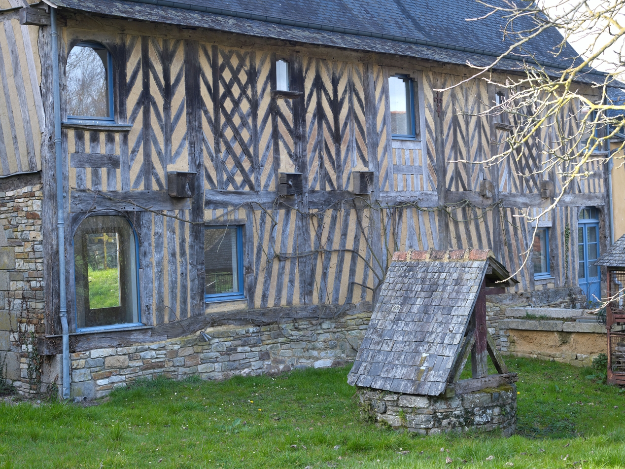 Vue rapprochée de la façade principale après restauration.Immatriculation