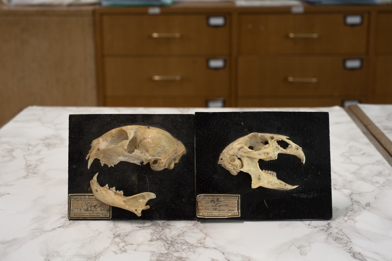 Demi-crânes de chat et de lapin - Zoologie – Embranchement des vertébrés (Etablissements du Docteur Auzoux, 1950-1975)Immatriculation