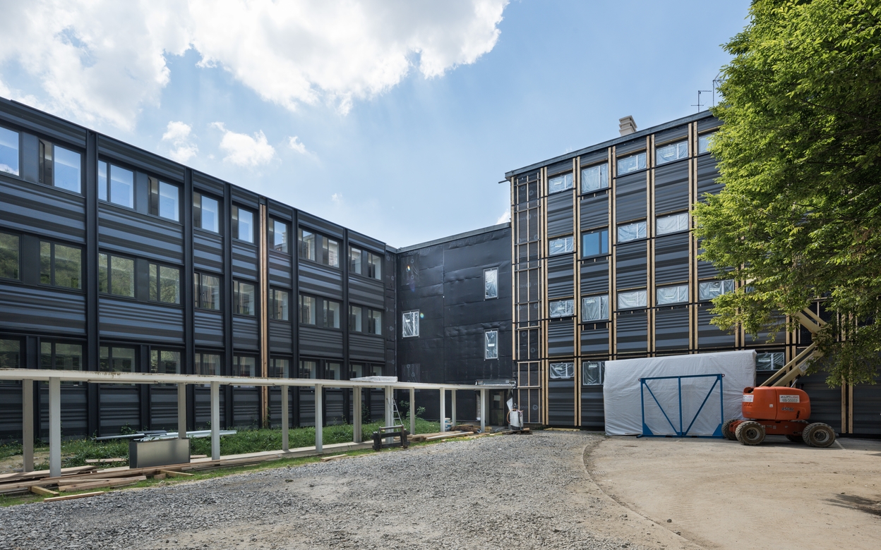 Travaux d'isolation extérieure, angle nord-est des bâtiments A et C. Groupe Legendre, architecte : Anthracite 2.0Immatriculation