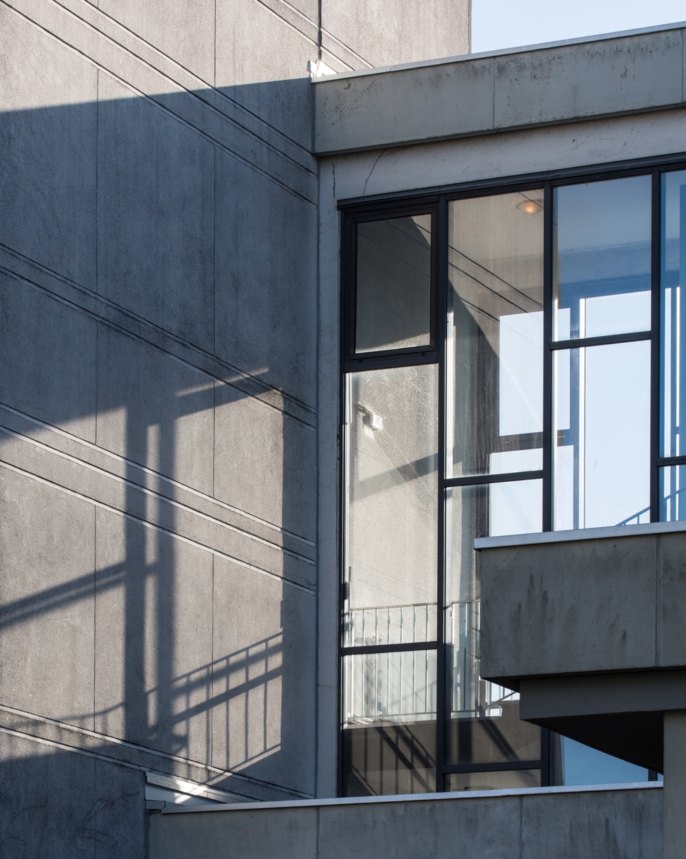 Cage d'escalier vitrée entre les bâtiments A et A2 (administration et logements), prise côté est. Louis Arretche et Jean Lemercier, architectes, 1967.Immatriculation