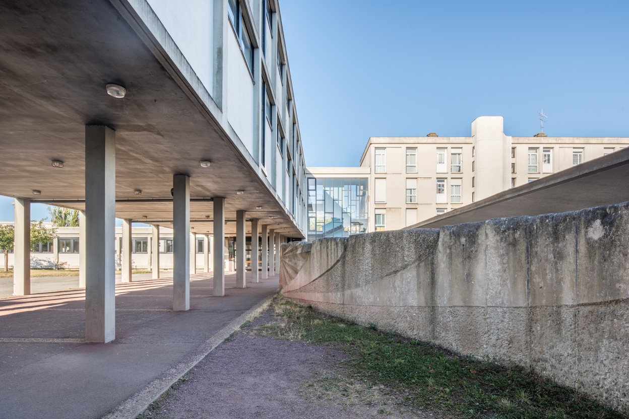 Sculpture "Coupe-Vent" de Yazuo Mizui (1976). Vue partielle. A l'arrière plan, bâtiment A2, logements et cage d'escalier vitrée (Louis Arretche et Jean Lemercier, architectes, 1967).Immatriculation