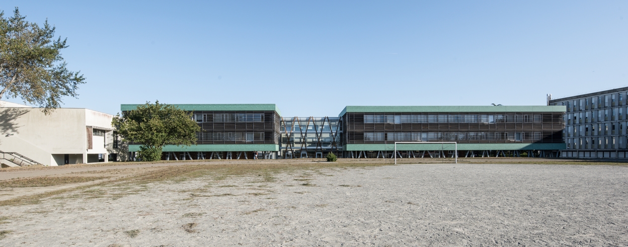 Façade sud de l'espace sciences (bâtiments B2 et B3), Thierry Soquet, architecte, 2015. A gauche, le gymnase, à droite, l'inetrnat de garçons (bâtiment D).Immatriculation