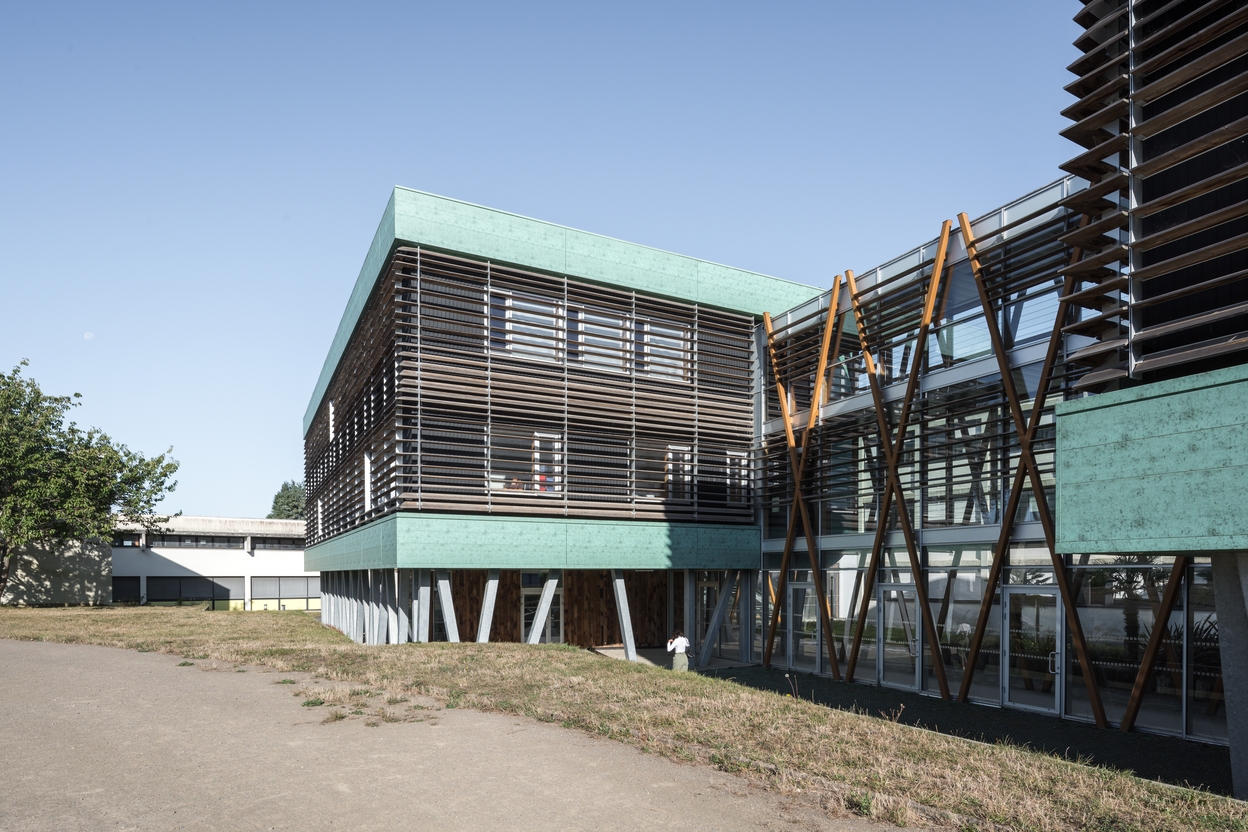 Façade est du bâtiments B2 (espace sciences) et galerie de liaison. Thierry Soquet, architecte, 2015.Immatriculation