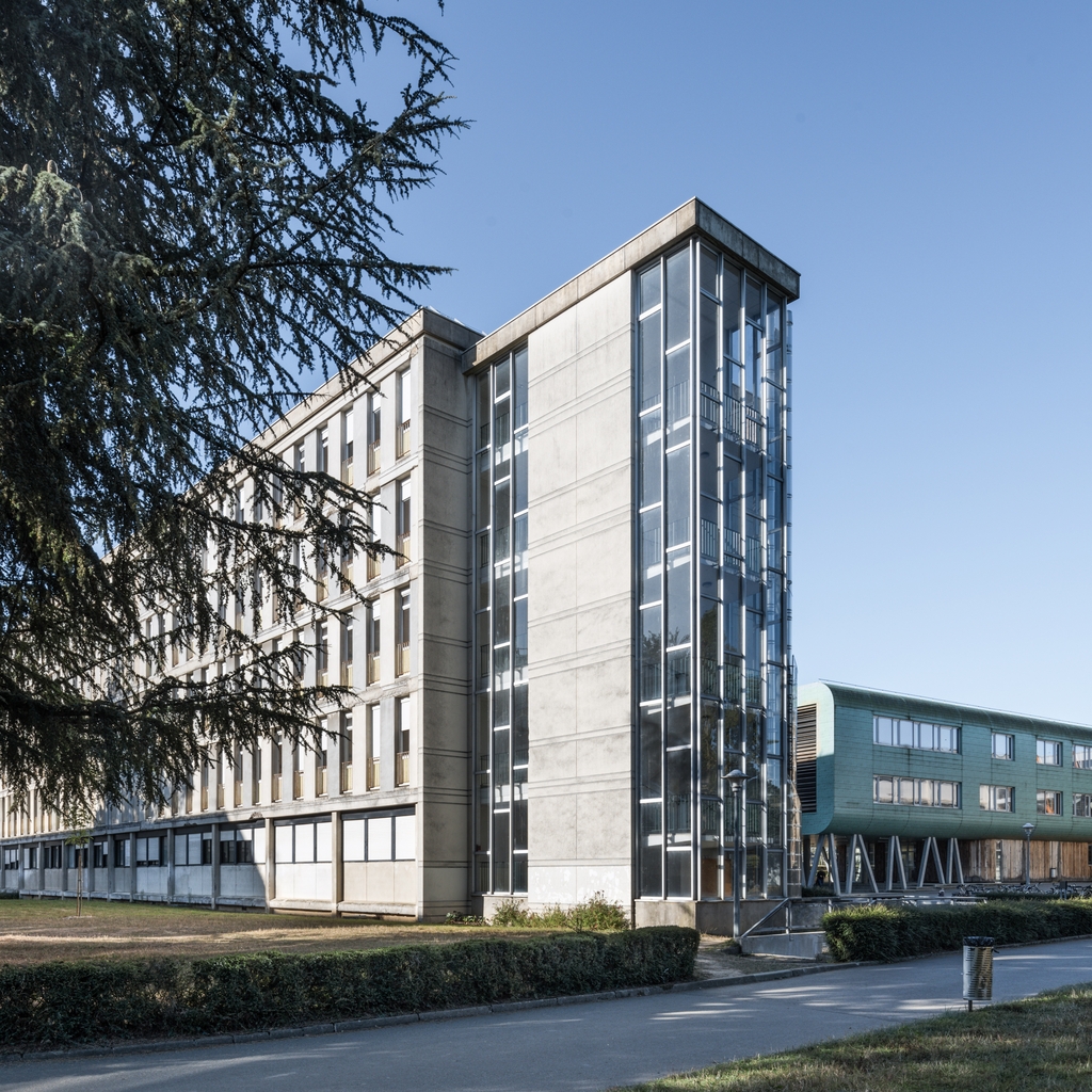 Cage d'escalier vitrée au nord de l'internat de garçons (bâtiment D), Louis Arretche et Jean Lemercier, architectes, 1967. A droite, façade nord du bâtiment B3, espace sciences, Thierry Soquet, architecte, 2015.Immatriculation