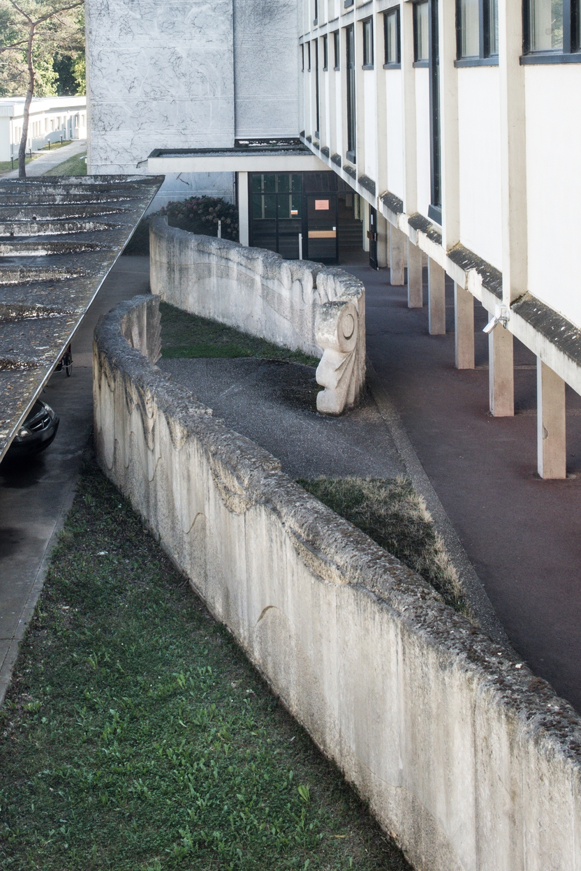 Sculpture de Yazuo Mizui (1976), en pierre de Vassens, formant brise-vent pour le préau (à droite) et dallage d'accompagnement en galets. A gauche, toiture de l'abri à bicyclettes.Immatriculation