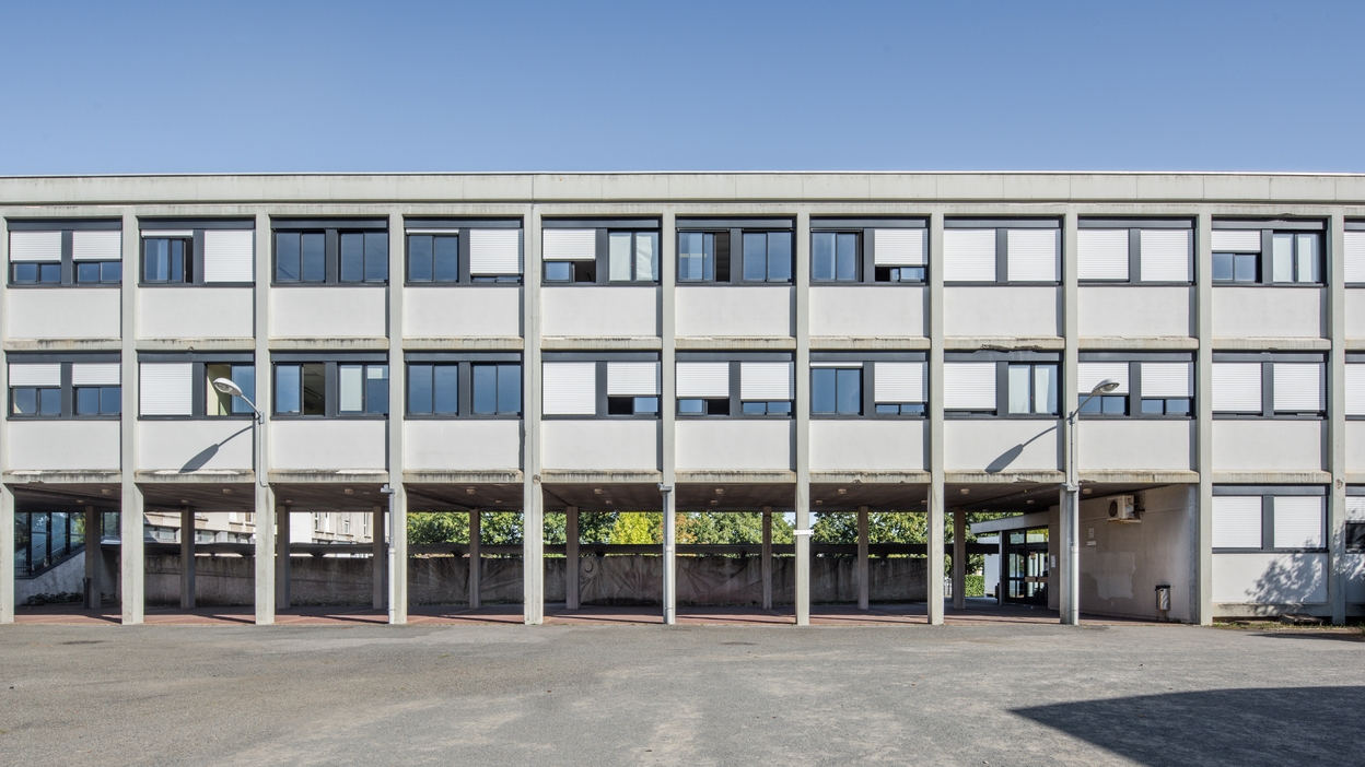 Façade sud (partielle) de l’externat (B). A travers le préau, on aperçoit la sculpture de Yazuo Mizui (1976). Louis Arretche et Jean Lemercier, architectes, 1967.Immatriculation