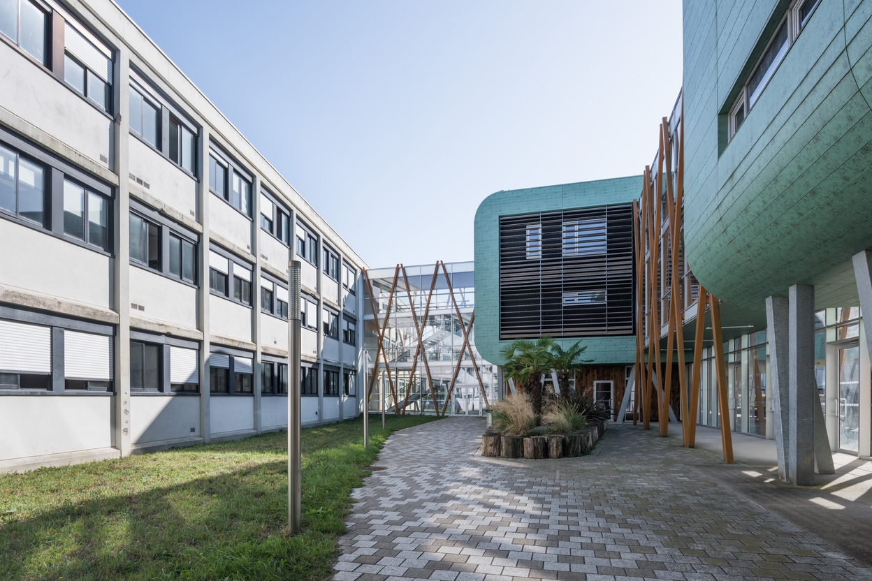 Façade sud de l'externat (B), passerelle de liaison, façade nord de l'espace sciences (B2).Immatriculation