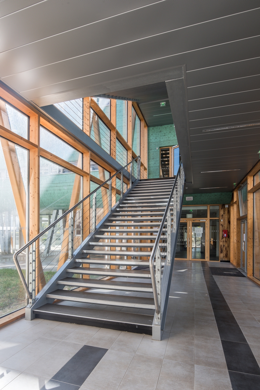 Cage d'escalier dans un bâtiment de liaison (passerelle) entre l'externat B et l'espace sciences. Thierry Soquet, architecte, 2015.Immatriculation