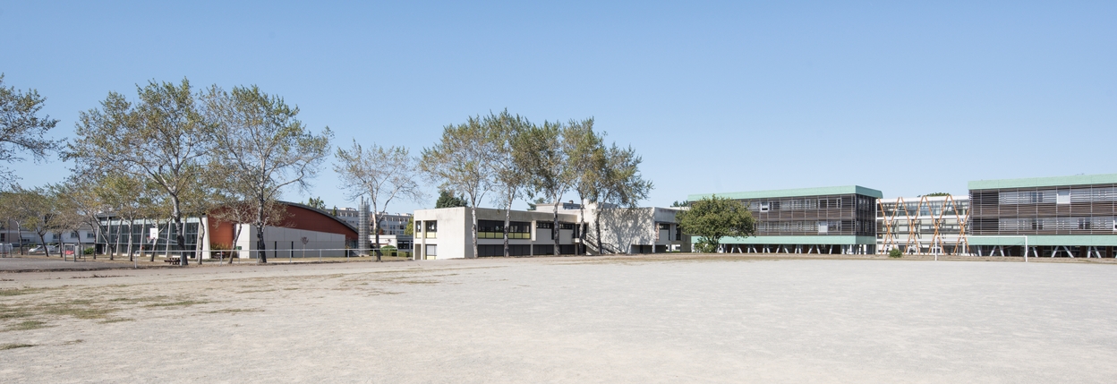 Vue panoramique d'ensemble prise du sud-est : de gauche à droite, gymnase, CDI, espace sciences. A l'arrière plan entre les deux premiers, bâtiment A, administration.Immatriculation