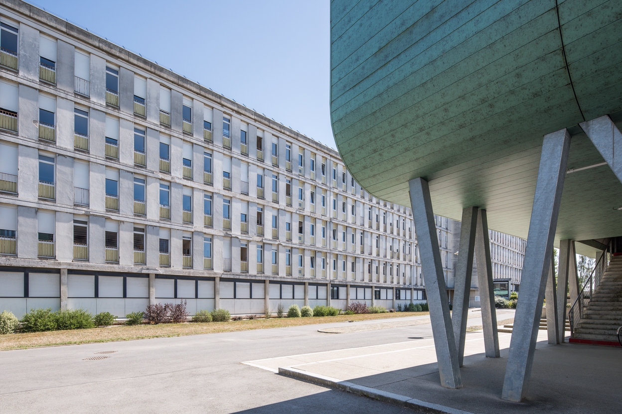 Façade ouest de l'internat de garçons (Louis Arretche et Jean Lemercier, architectes, 1967) et extrémité nord-est de l'espace sciences (Thierry Soquet, architecte, 2015).Immatriculation