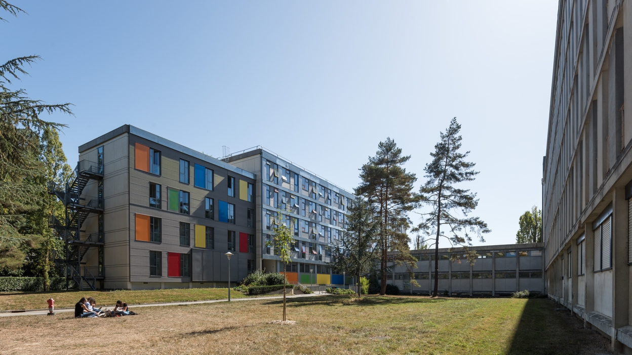 Façade ouest de l'internat de filles (bâtiment F) (Louis Arretche et Jean Lemercier, architectes, 1967, réhabilitation Isabelle Hiault et Maryvonne Rigourd, architectes, 2013). Au centre et à droite, bâtiments E et D.Immatriculation