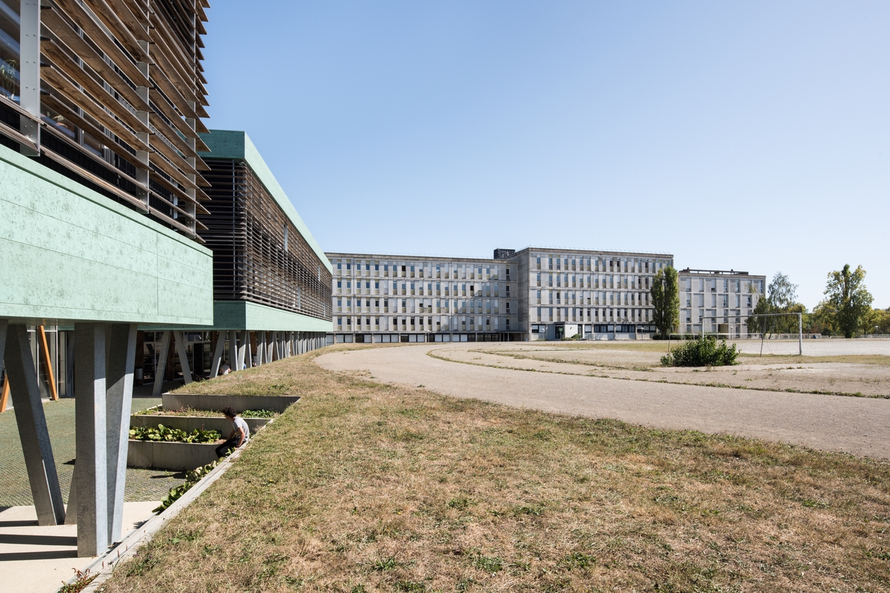 Façades sud de l'espace sciences (bâtiments B2 et B3), Thierry Soquet, architecte, 2015, et façade ouest de l'internat de garçons (bâtiment D), Louis Arretche et Jean Lemercier, architectes, 1967.Immatriculation