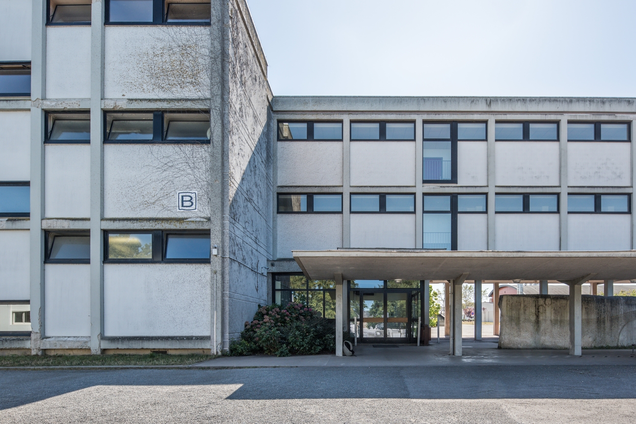 Détail de la façade nord de l'externat B (Louis Arretche et Jean Lemercier, architectes, 1967). Noter l’harmonie de l'articulation des volumes, la complémentarité entre le auvent de l'entrée et l'abri à vélos, ainsi que le rôle de la sculpture de Yazuo Mizui.Immatriculation