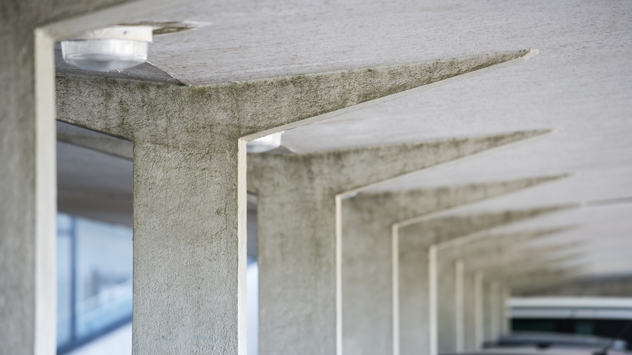 Abri pour deux roues : détail de la structure en béton. Louis Arretche et Jean Lemercier, architectes, 1967.Immatriculation